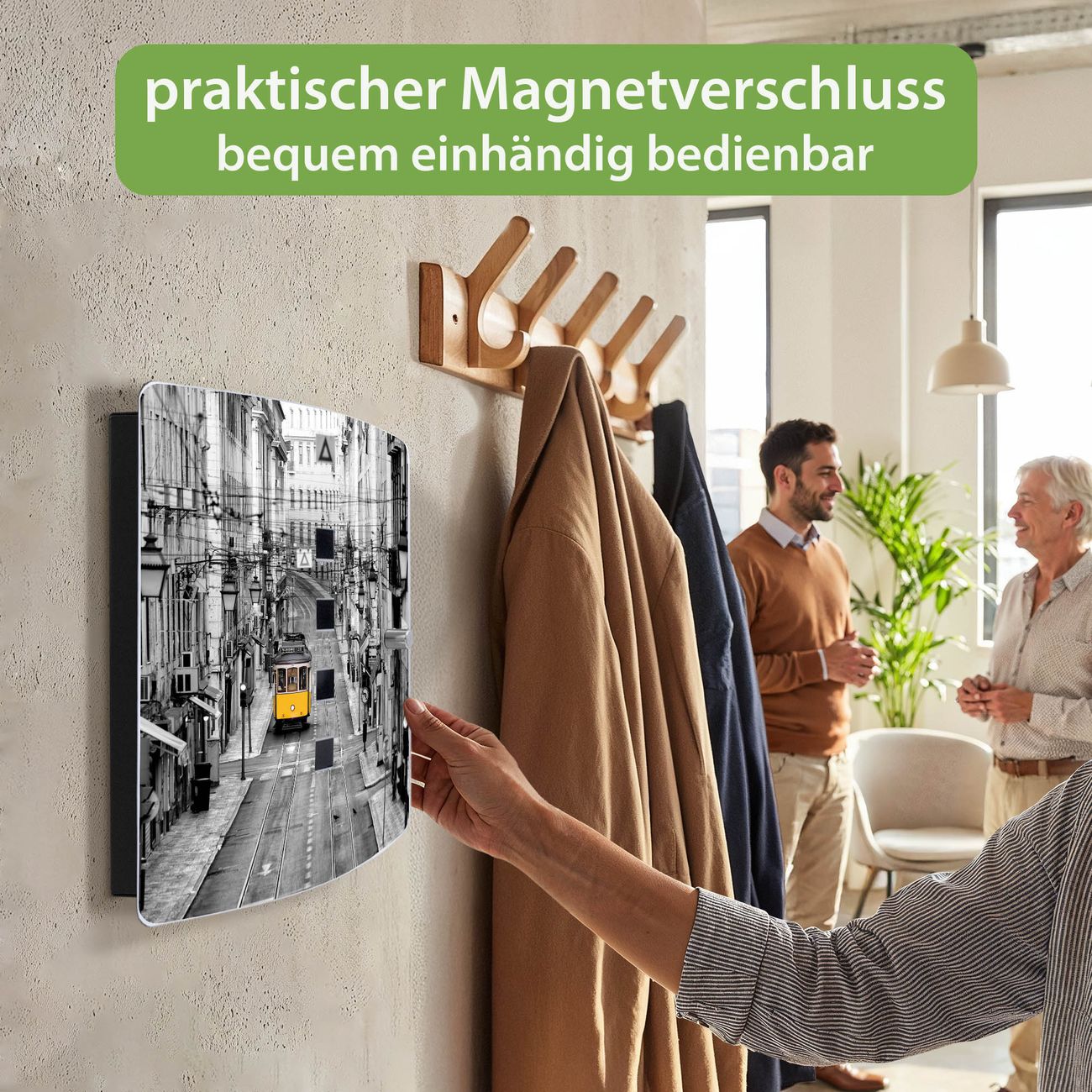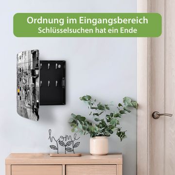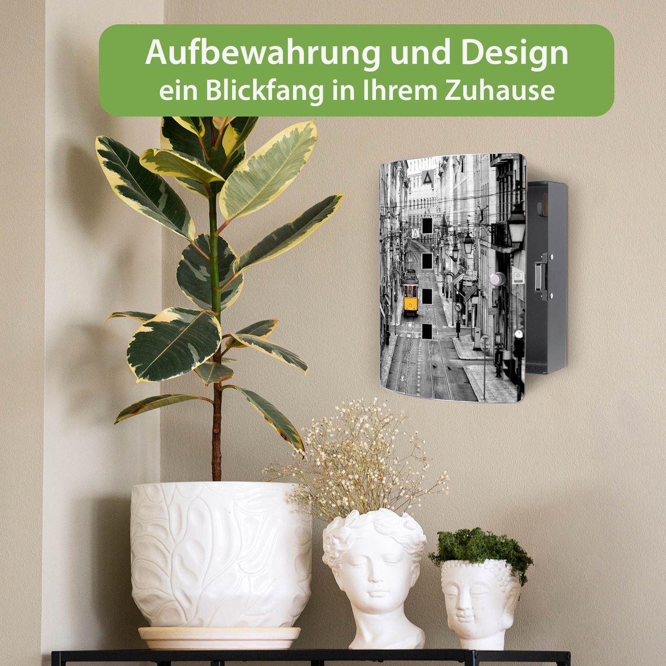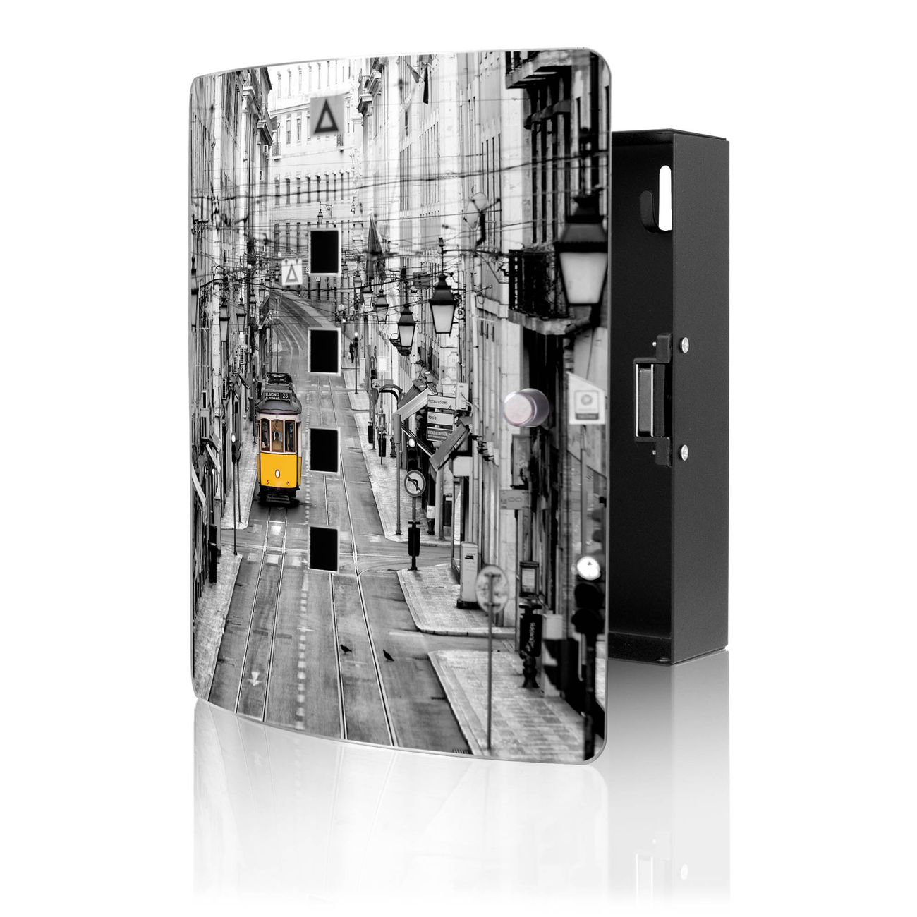 Funktion / Nutzen: Die leicht geschwungene Edelstahltür ist mit einer hochwertigen Motivfolie und dem Motiv Motiv Lissabon kaschiert. Ein praktischer Magnetverschluss ermöglicht Ihnen ein schnelles Öffnen und Schließen. Befestigt wird der Schlüsselkasten an 2 Stellen auf der Rückseite, passendes Montagematerial fügen wir bereits bei.