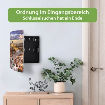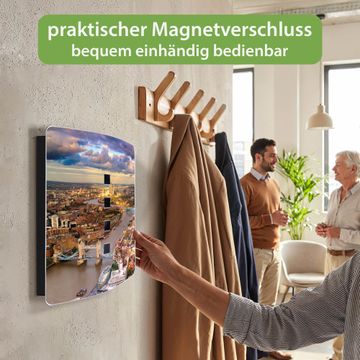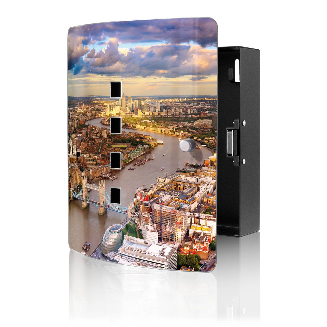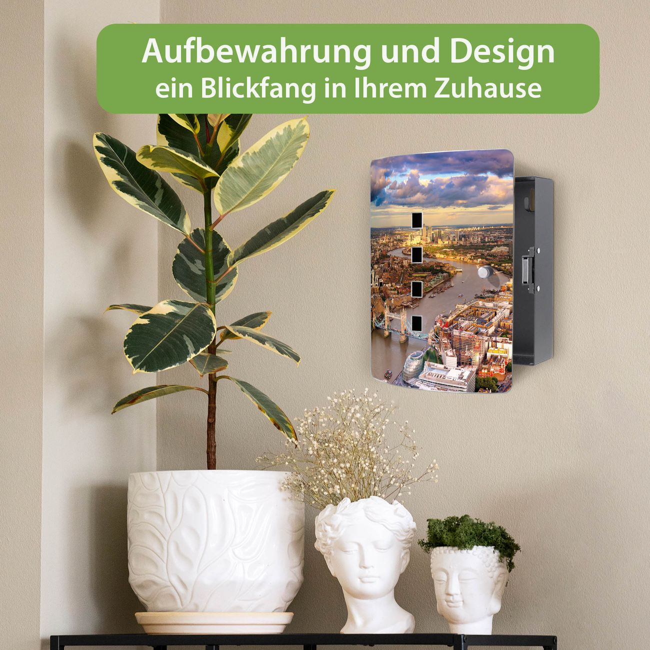 Funktion / Nutzen: Die leicht geschwungene Edelstahltür ist mit einer hochwertigen Motivfolie und dem Motiv Motiv London kaschiert. Ein praktischer Magnetverschluss ermöglicht Ihnen ein schnelles Öffnen und Schließen. Befestigt wird der Schlüsselkasten an 2 Stellen auf der Rückseite, passendes Montagematerial fügen wir bereits bei.