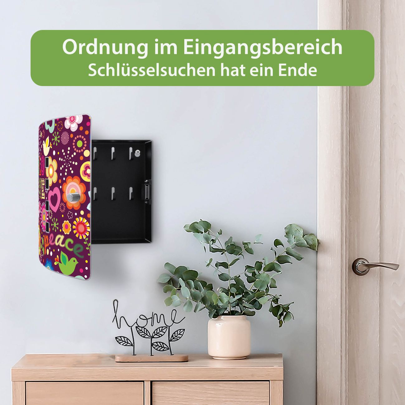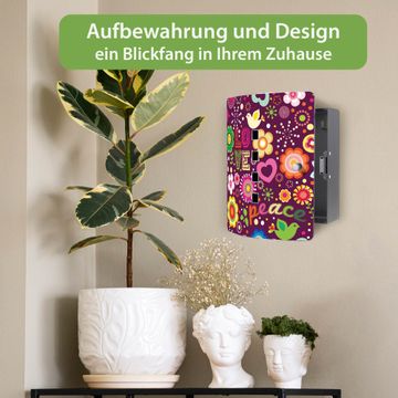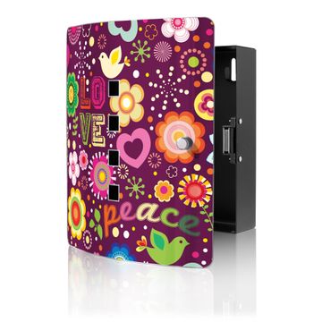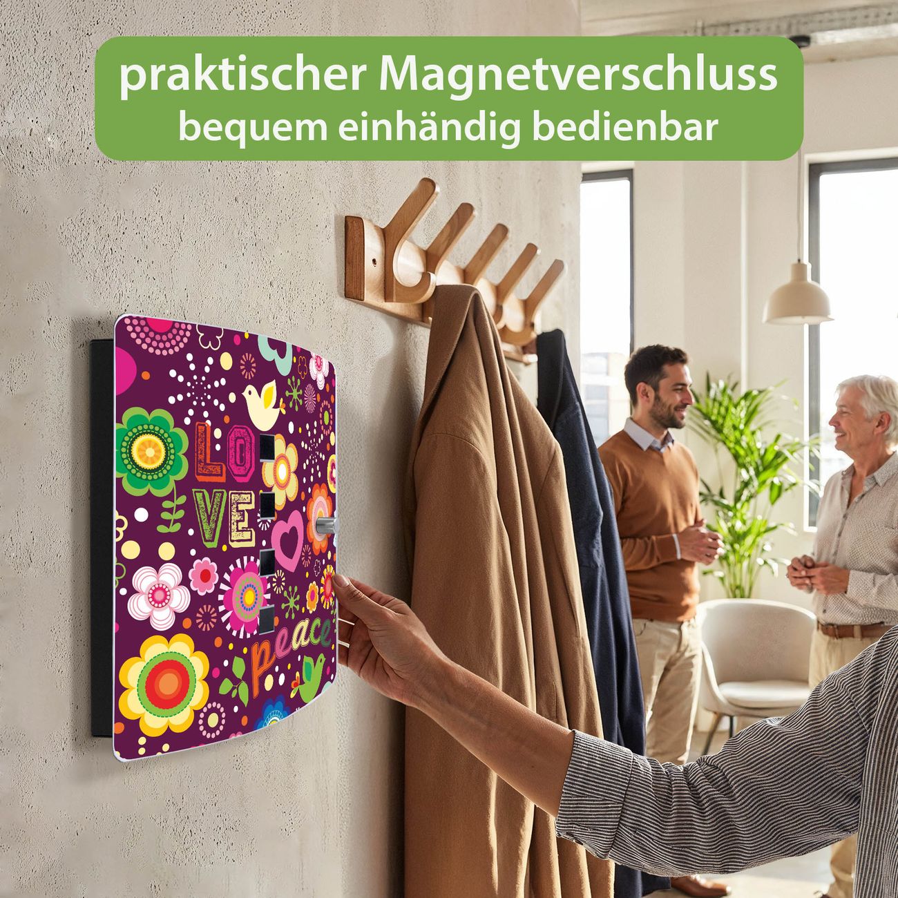Funktion / Nutzen: Die leicht geschwungene Edelstahltür ist mit einer hochwertigen Motivfolie und dem Motiv Motiv Love and Peace kaschiert. Ein praktischer Magnetverschluss ermöglicht Ihnen ein schnelles Öffnen und Schließen. Befestigt wird der Schlüsselkasten an 2 Stellen auf der Rückseite, passendes Montagematerial fügen wir bereits bei.