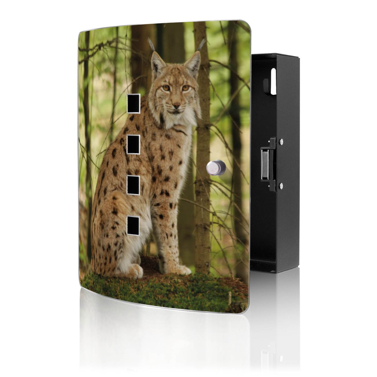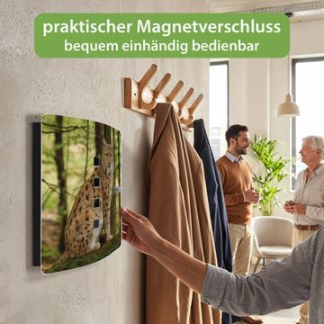 Funktion / Nutzen: Die leicht geschwungene Edelstahltür ist mit einer hochwertigen Motivfolie und dem Motiv Motiv Luchs kaschiert. Ein praktischer Magnetverschluss ermöglicht Ihnen ein schnelles Öffnen und Schließen. Befestigt wird der Schlüsselkasten an 2 Stellen auf der Rückseite, passendes Montagematerial fügen wir bereits bei.