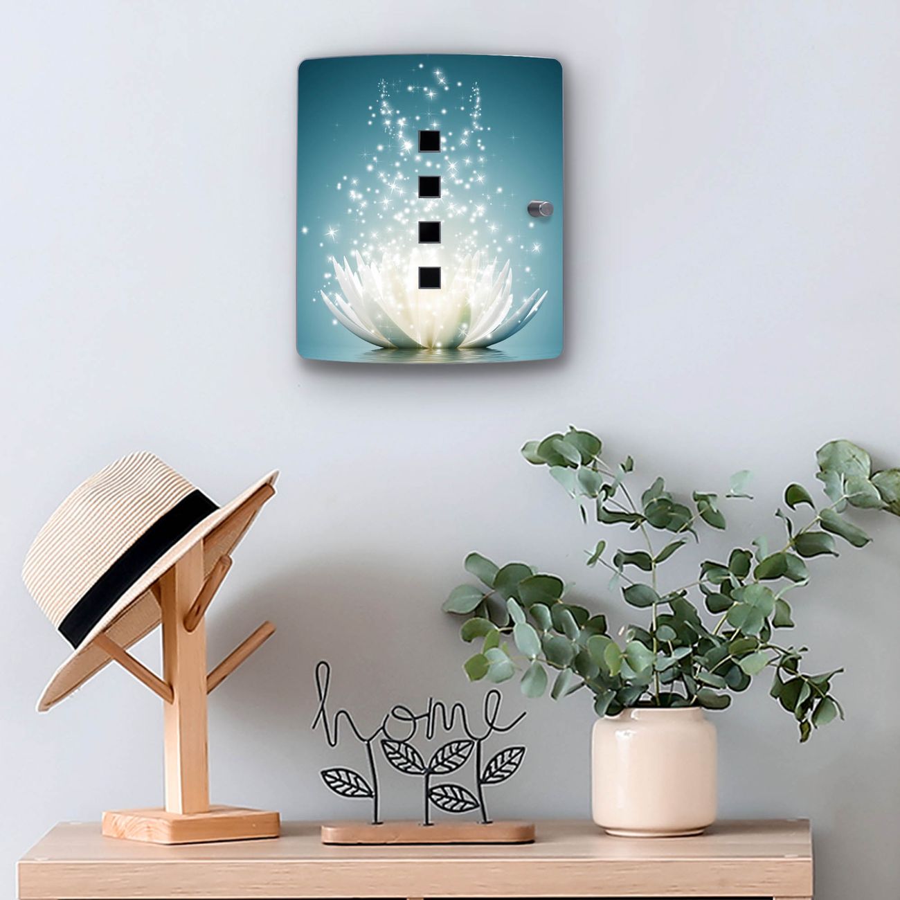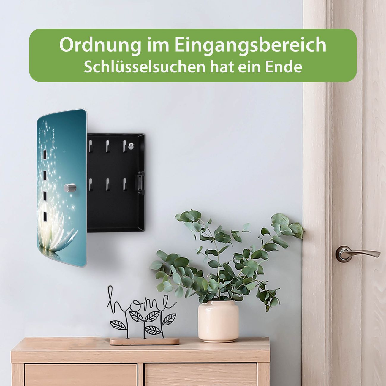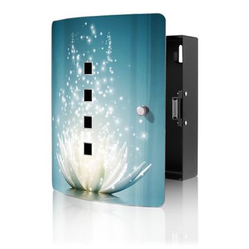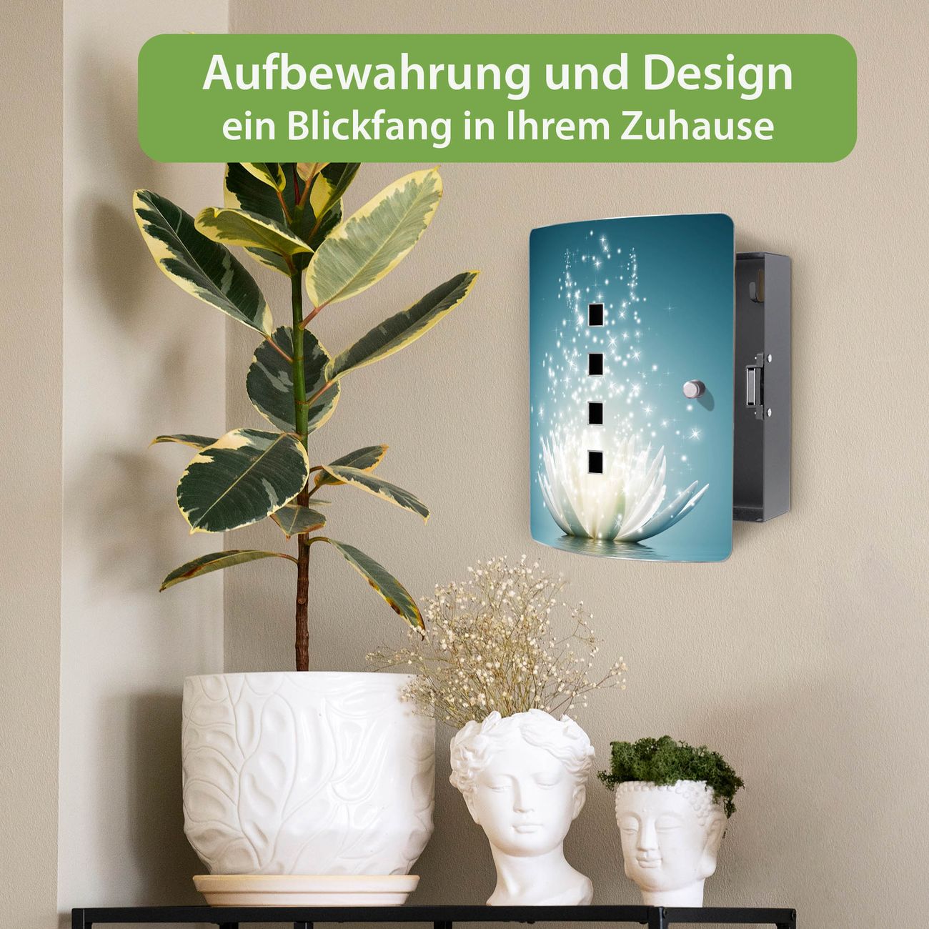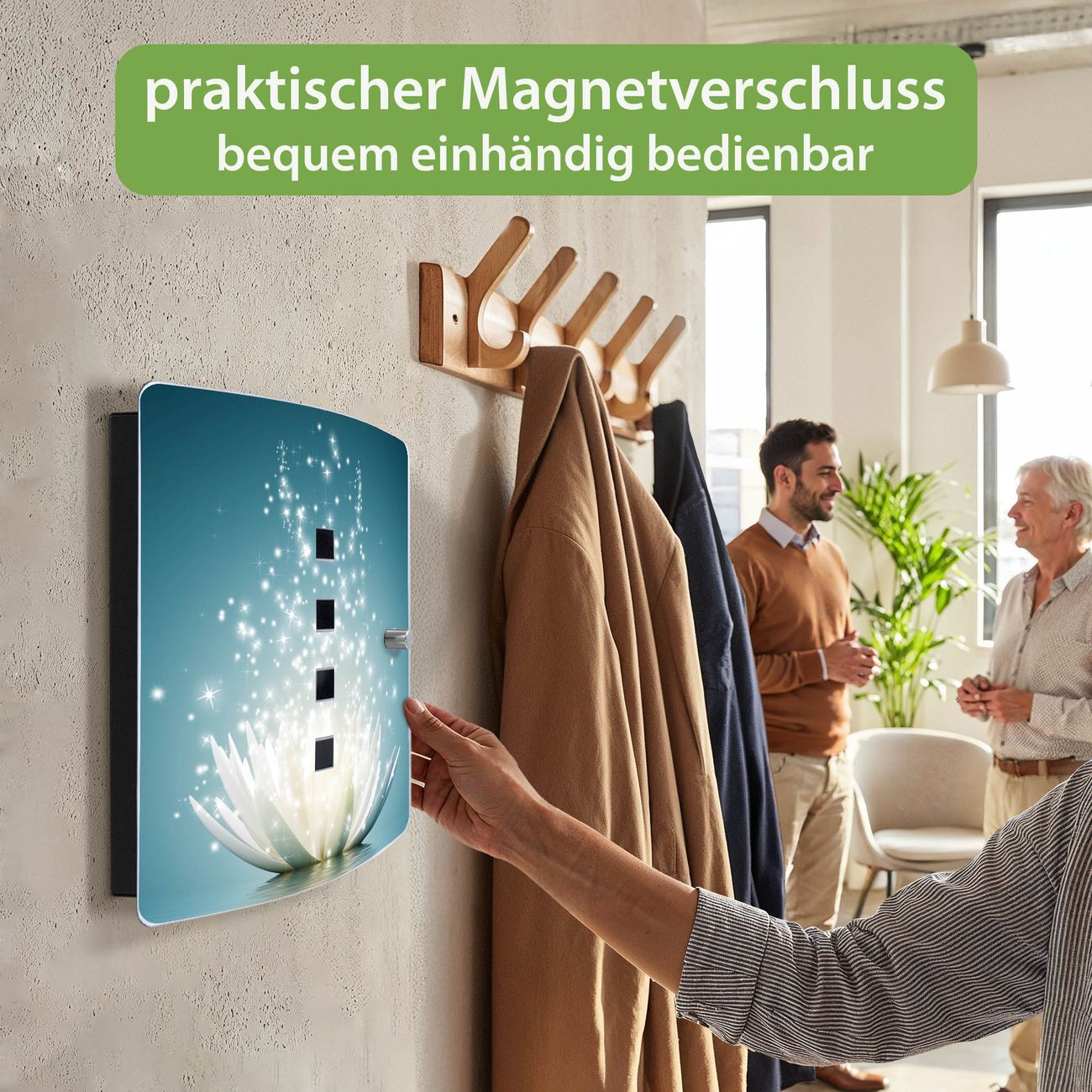 Funktion / Nutzen: Die leicht geschwungene Edelstahltür ist mit einer hochwertigen Motivfolie und dem Motiv Motiv Magische Lotusblüte kaschiert. Ein praktischer Magnetverschluss ermöglicht Ihnen ein schnelles Öffnen und Schließen. Befestigt wird der Schlüsselkasten an 2 Stellen auf der Rückseite, passendes Montagematerial fügen wir bereits bei.