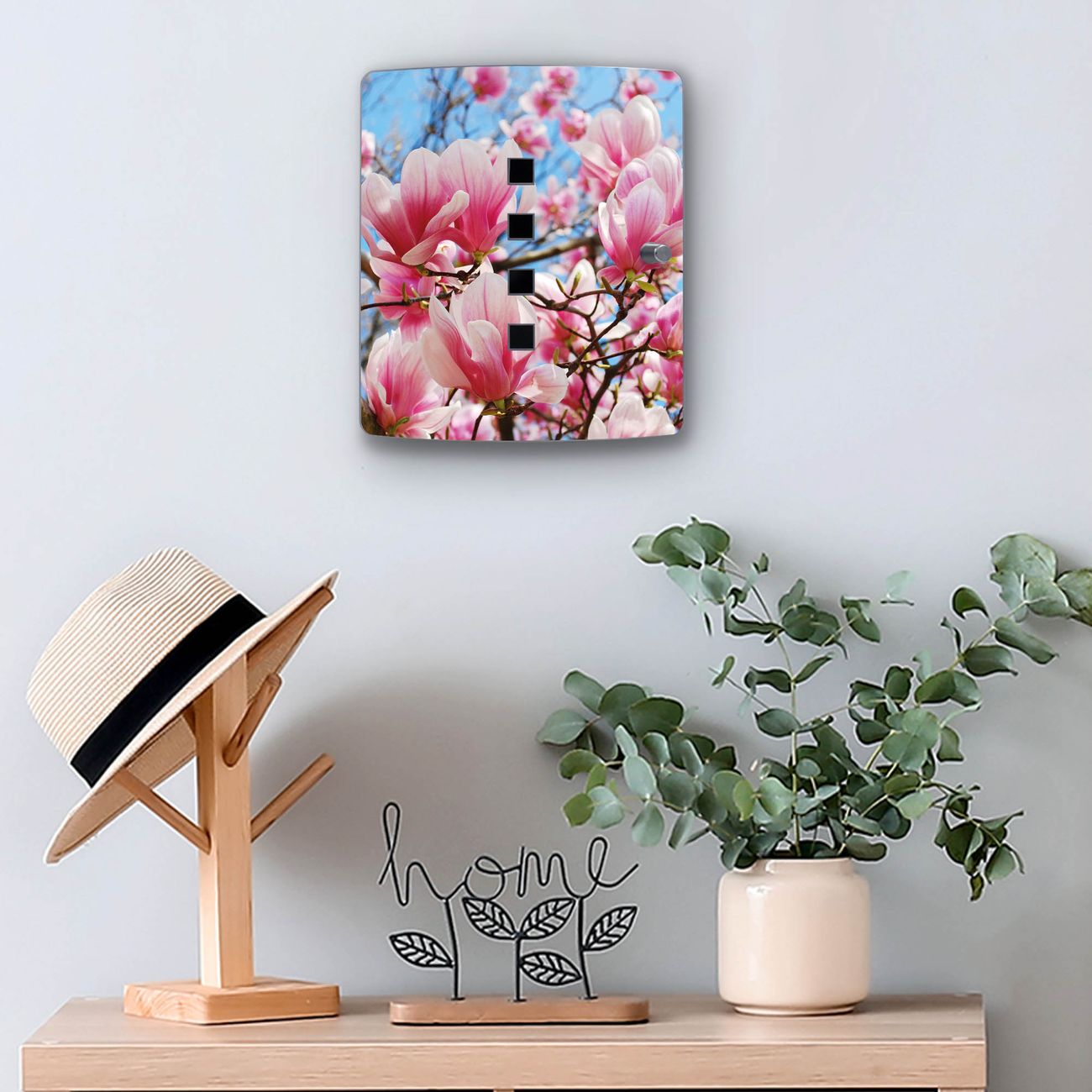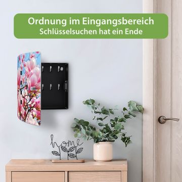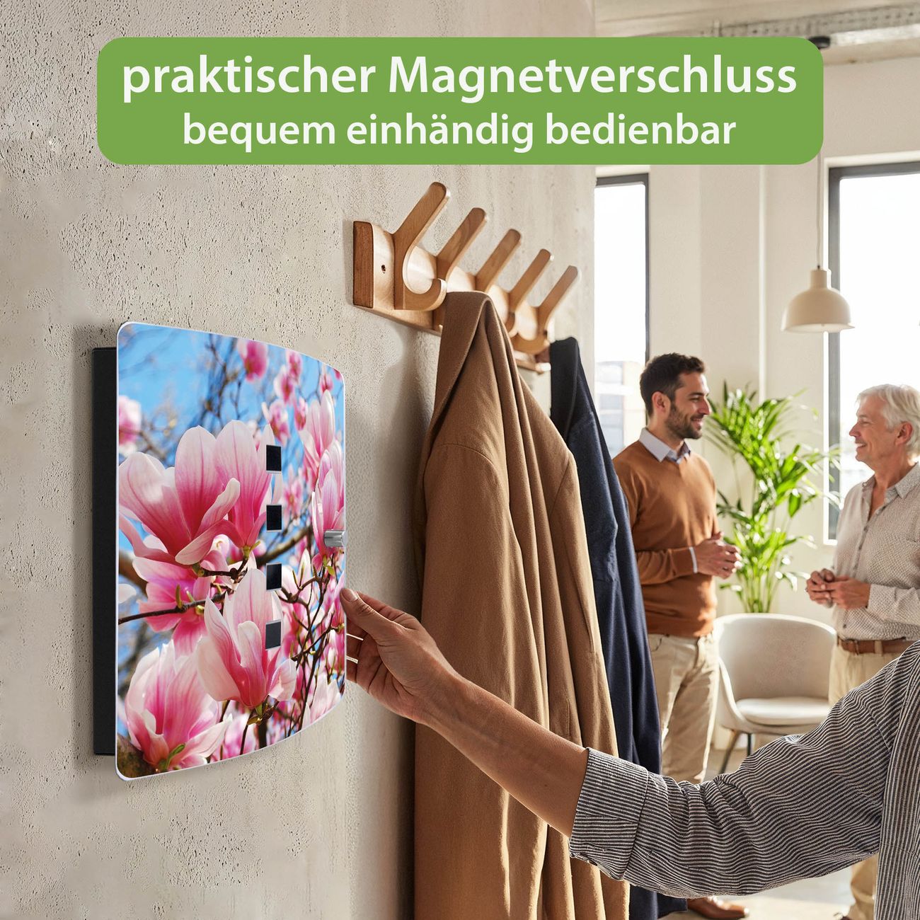 Funktion / Nutzen: Die leicht geschwungene Edelstahltür ist mit einer hochwertigen Motivfolie und dem Motiv Motiv Magnolienbaum kaschiert. Ein praktischer Magnetverschluss ermöglicht Ihnen ein schnelles Öffnen und Schließen. Befestigt wird der Schlüsselkasten an 2 Stellen auf der Rückseite, passendes Montagematerial fügen wir bereits bei.