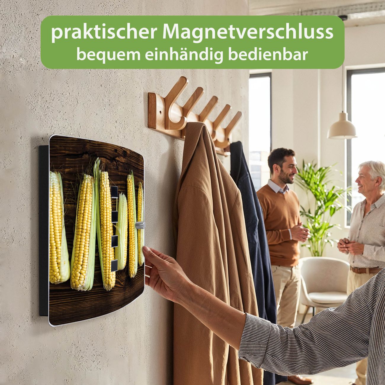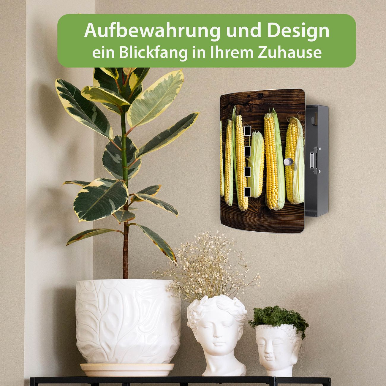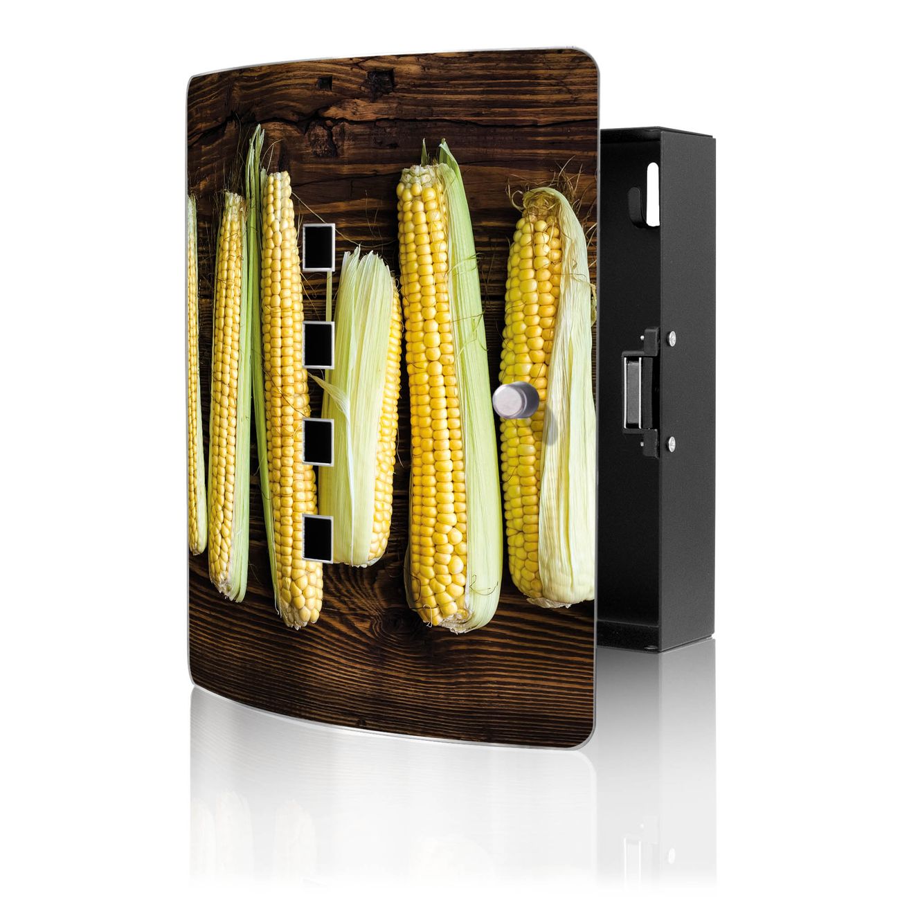 Funktion / Nutzen: Die leicht geschwungene Edelstahltür ist mit einer hochwertigen Motivfolie und dem Motiv Motiv Maiskolben kaschiert. Ein praktischer Magnetverschluss ermöglicht Ihnen ein schnelles Öffnen und Schließen. Befestigt wird der Schlüsselkasten an 2 Stellen auf der Rückseite, passendes Montagematerial fügen wir bereits bei.