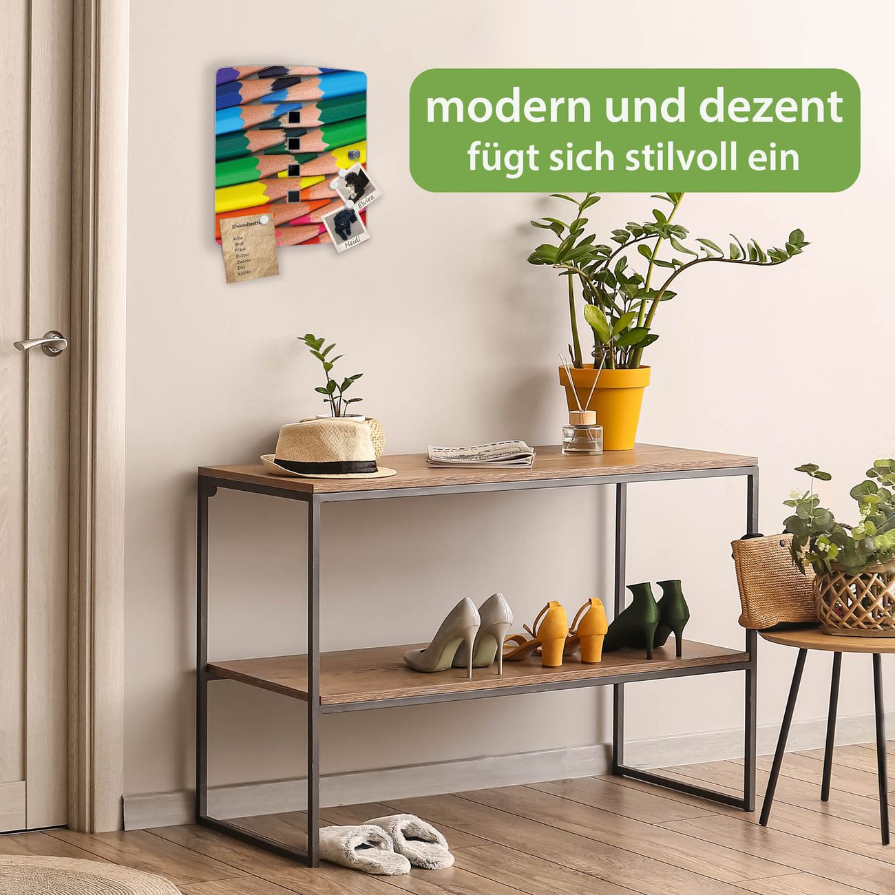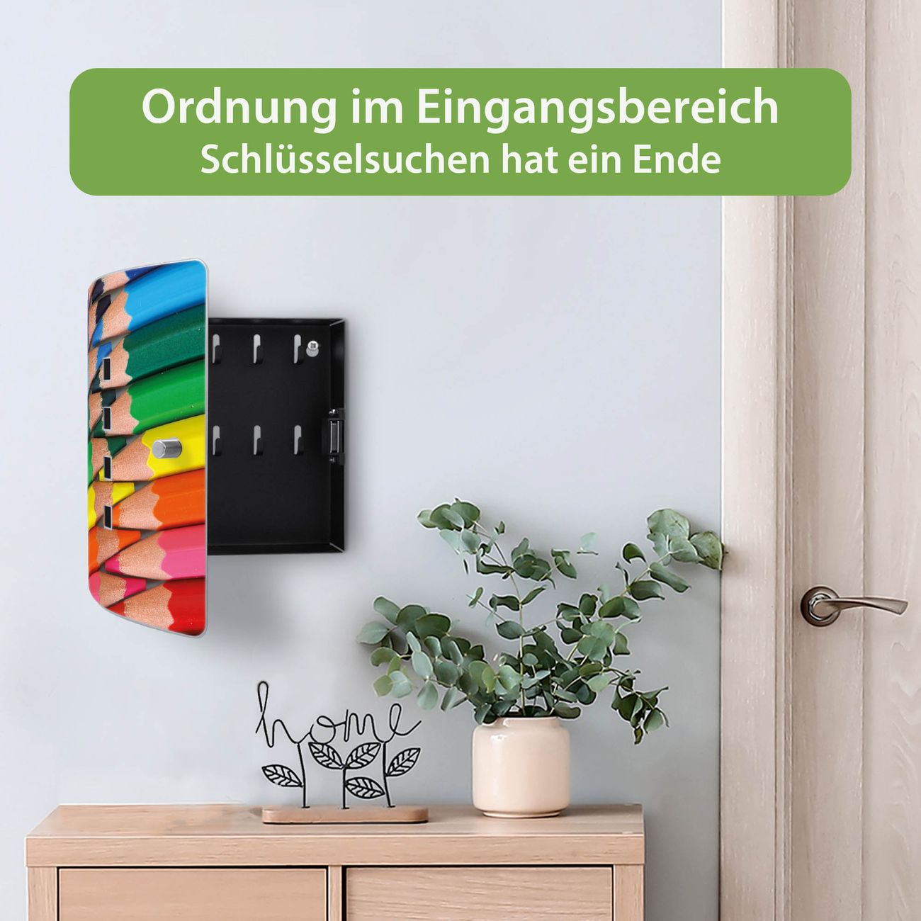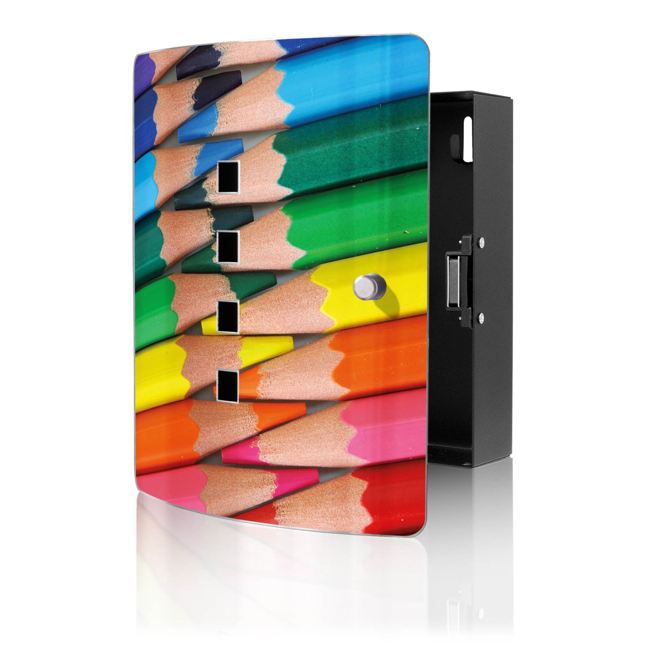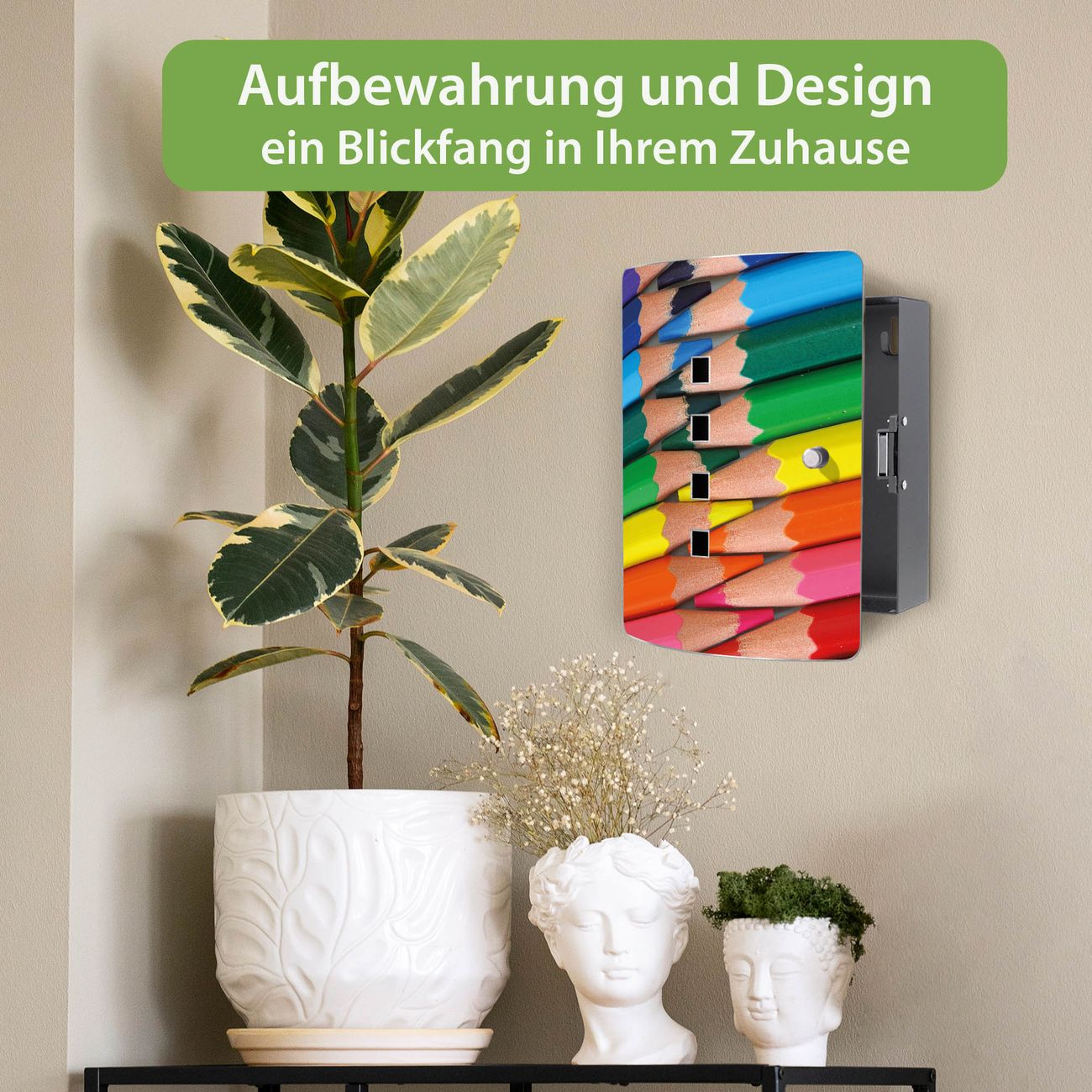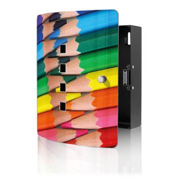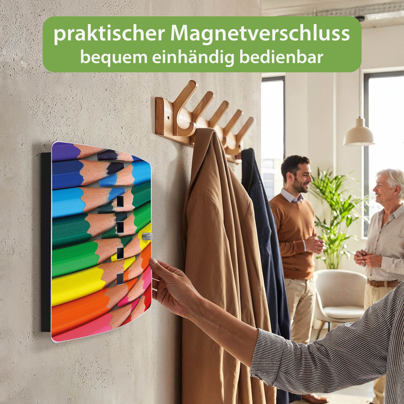Funktion / Nutzen: Die leicht geschwungene Edelstahltür ist mit einer hochwertigen Motivfolie und dem Motiv Motiv Malstifte kaschiert. Ein praktischer Magnetverschluss ermöglicht Ihnen ein schnelles Öffnen und Schließen. Befestigt wird der Schlüsselkasten an 2 Stellen auf der Rückseite, passendes Montagematerial fügen wir bereits bei.