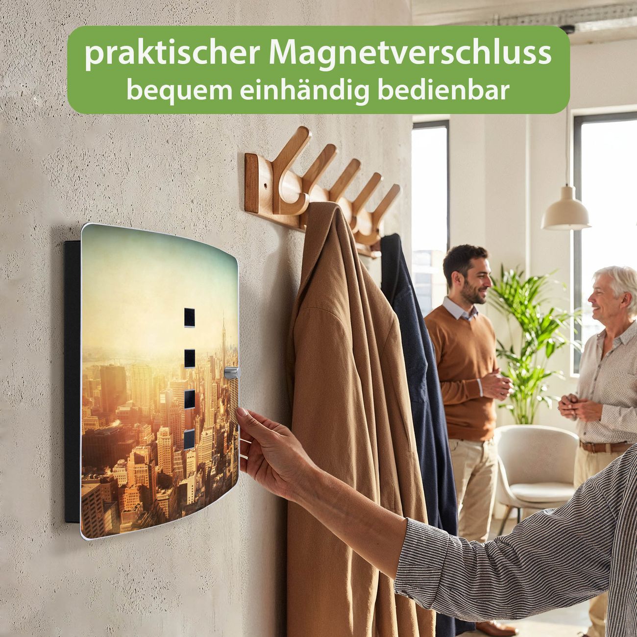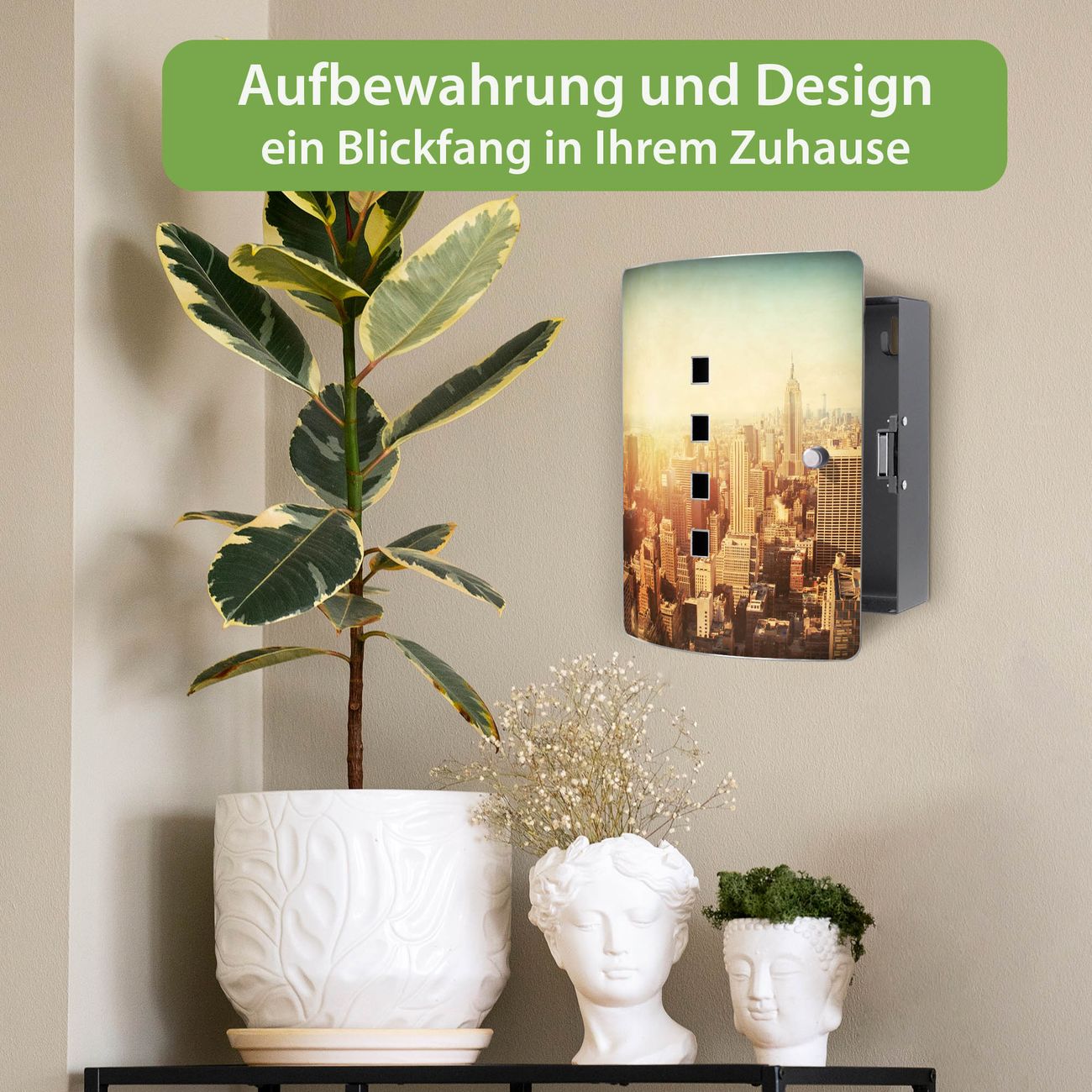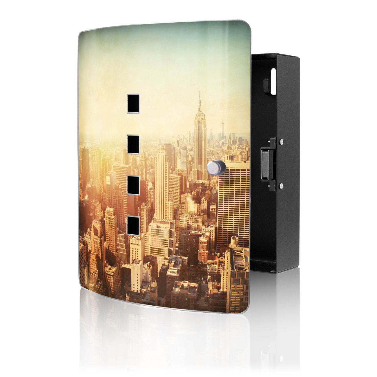 Funktion / Nutzen: Die leicht geschwungene Edelstahltür ist mit einer hochwertigen Motivfolie und dem Motiv Motiv Manhattan 2 kaschiert. Ein praktischer Magnetverschluss ermöglicht Ihnen ein schnelles Öffnen und Schließen. Befestigt wird der Schlüsselkasten an 2 Stellen auf der Rückseite, passendes Montagematerial fügen wir bereits bei.
