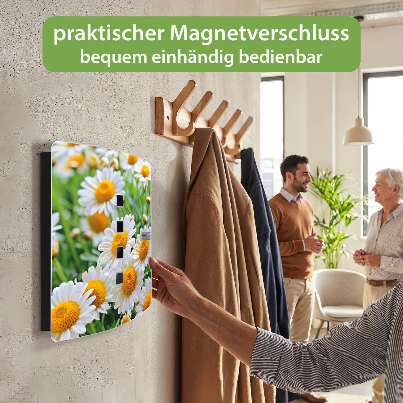 Funktion / Nutzen: Die leicht geschwungene Edelstahltür ist mit einer hochwertigen Motivfolie und dem Motiv Motiv Margeriten Illustration kaschiert. Ein praktischer Magnetverschluss ermöglicht Ihnen ein schnelles Öffnen und Schließen. Befestigt wird der Schlüsselkasten an 2 Stellen auf der Rückseite, passendes Montagematerial fügen wir bereits bei.