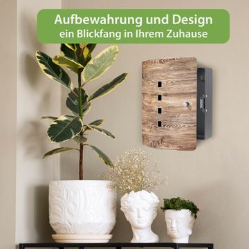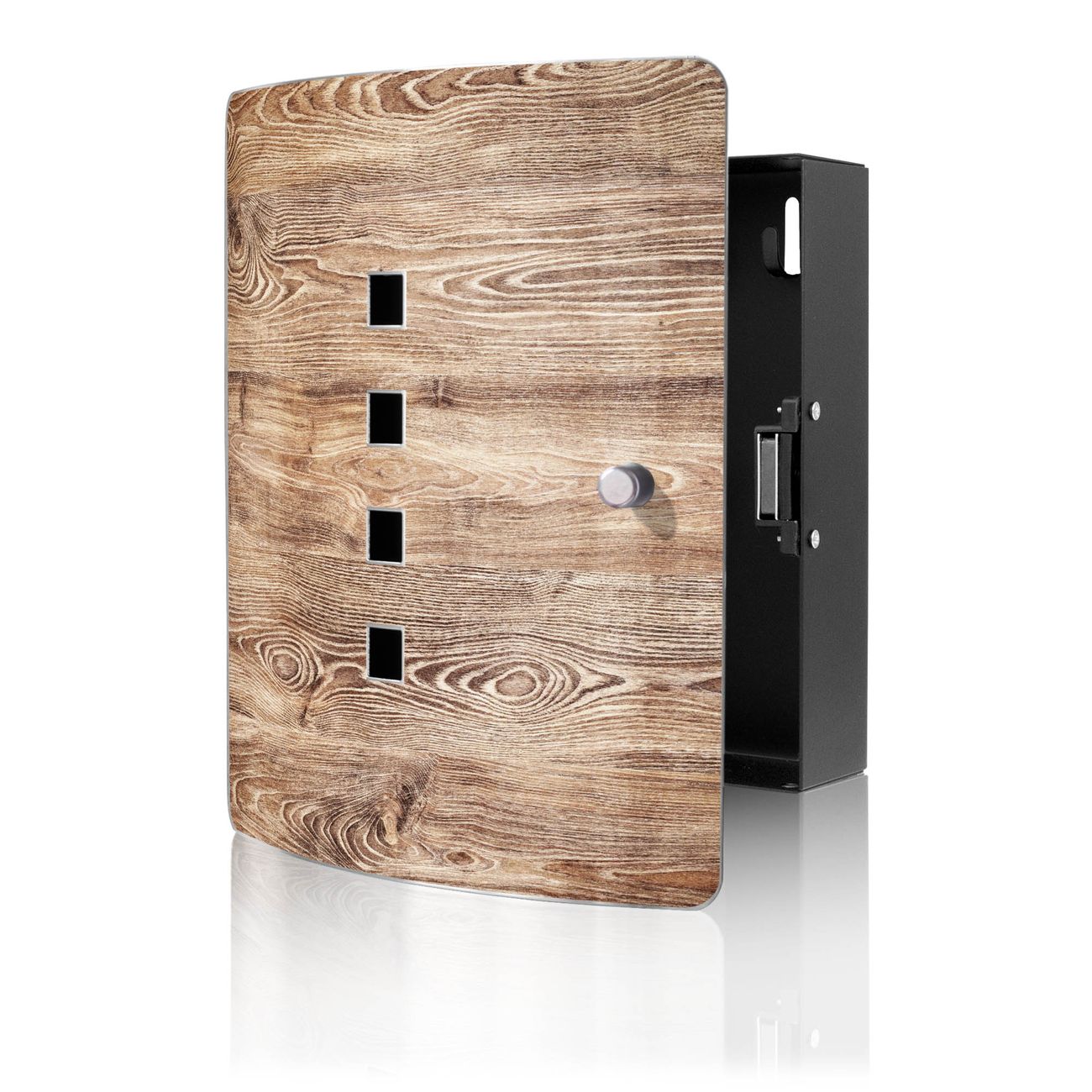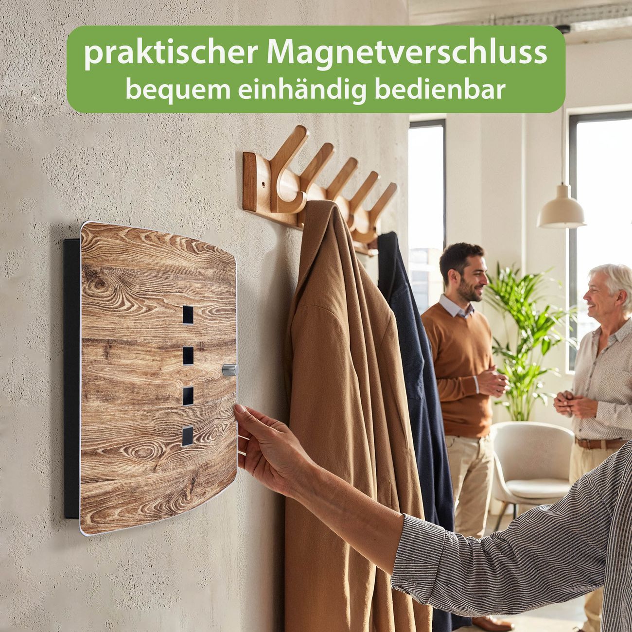 Funktion / Nutzen: Die leicht geschwungene Edelstahltür ist mit einer hochwertigen Motivfolie und dem Motiv Motiv Maserung kaschiert. Ein praktischer Magnetverschluss ermöglicht Ihnen ein schnelles Öffnen und Schließen. Befestigt wird der Schlüsselkasten an 2 Stellen auf der Rückseite, passendes Montagematerial fügen wir bereits bei.