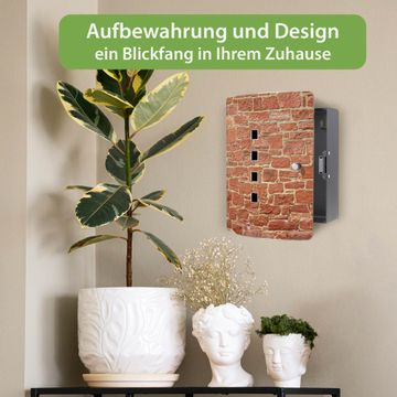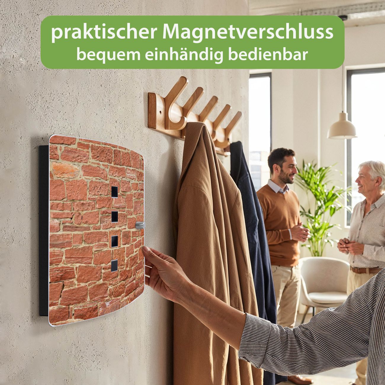 Funktion / Nutzen: Die leicht geschwungene Edelstahltür ist mit einer hochwertigen Motivfolie und dem Motiv Motiv Mauerwerk kaschiert. Ein praktischer Magnetverschluss ermöglicht Ihnen ein schnelles Öffnen und Schließen. Befestigt wird der Schlüsselkasten an 2 Stellen auf der Rückseite, passendes Montagematerial fügen wir bereits bei.