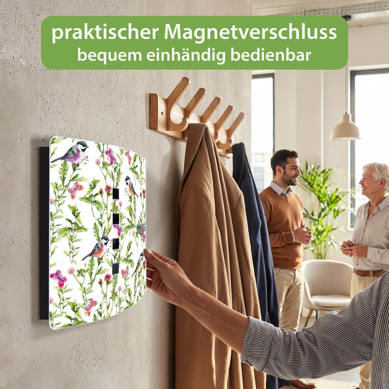 Funktion / Nutzen: Die leicht geschwungene Edelstahltür ist mit einer hochwertigen Motivfolie und dem Motiv Motiv Meisen im Klee kaschiert. Ein praktischer Magnetverschluss ermöglicht Ihnen ein schnelles Öffnen und Schließen. Befestigt wird der Schlüsselkasten an 2 Stellen auf der Rückseite, passendes Montagematerial fügen wir bereits bei.