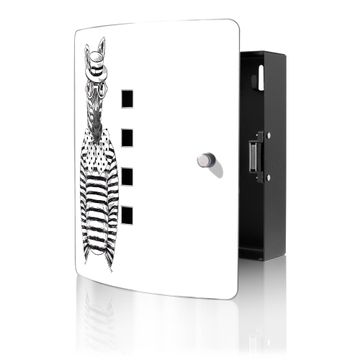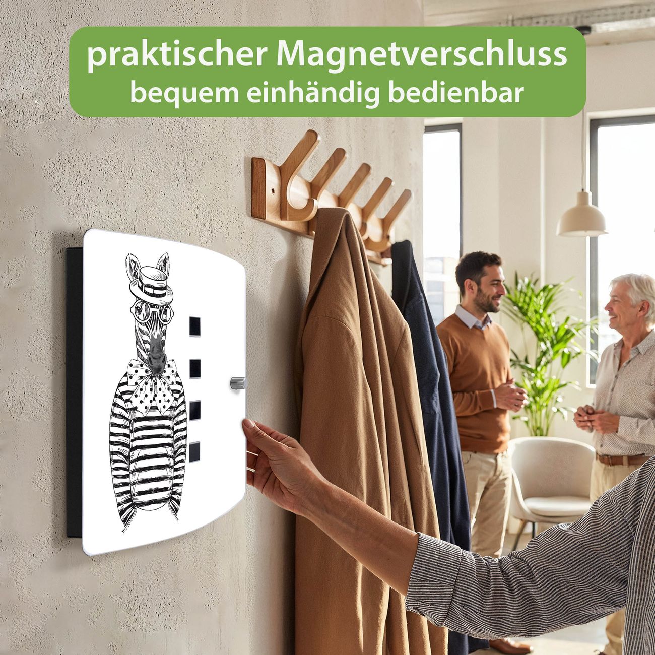 Funktion / Nutzen: Die leicht geschwungene Edelstahltür ist mit einer hochwertigen Motivfolie und dem Motiv Motiv Michael Stripes kaschiert. Ein praktischer Magnetverschluss ermöglicht Ihnen ein schnelles Öffnen und Schließen. Befestigt wird der Schlüsselkasten an 2 Stellen auf der Rückseite, passendes Montagematerial fügen wir bereits bei.