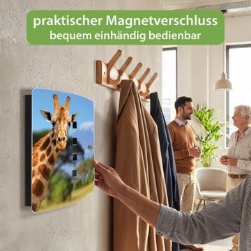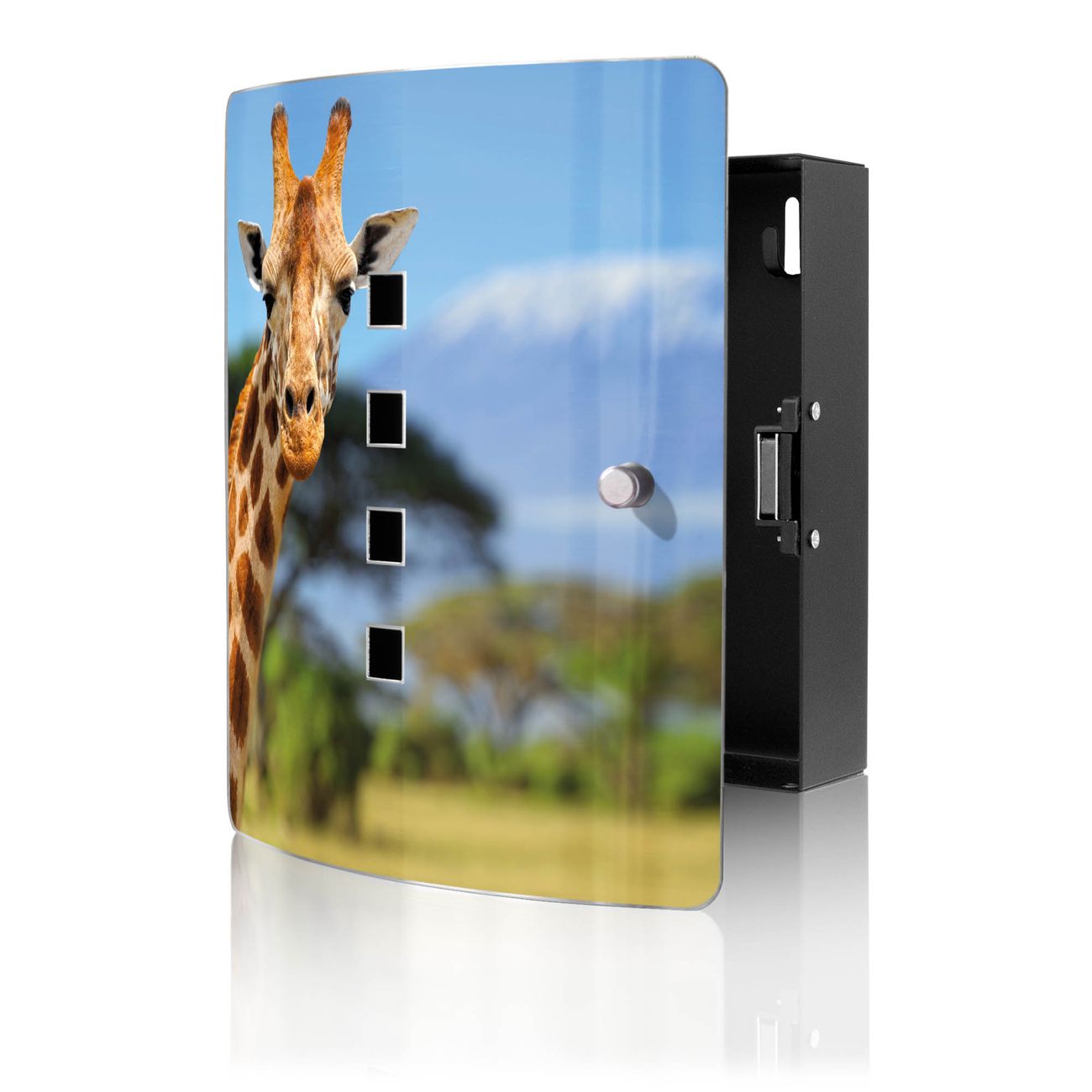 Funktion / Nutzen: Die leicht geschwungene Edelstahltür ist mit einer hochwertigen Motivfolie und dem Motiv Motiv Miss Kilimandscharo kaschiert. Ein praktischer Magnetverschluss ermöglicht Ihnen ein schnelles Öffnen und Schließen. Befestigt wird der Schlüsselkasten an 2 Stellen auf der Rückseite, passendes Montagematerial fügen wir bereits bei.