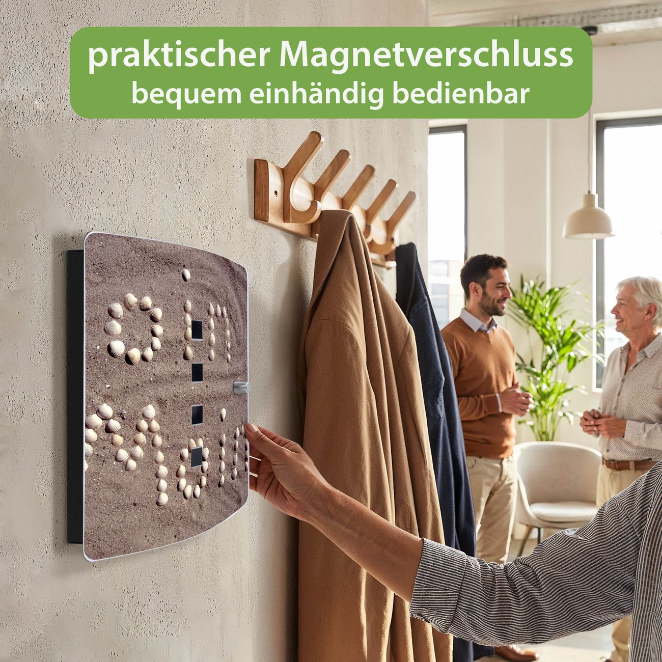Funktion / Nutzen: Die leicht geschwungene Edelstahltür ist mit einer hochwertigen Motivfolie und dem Motiv Motiv Moin Moin kaschiert. Ein praktischer Magnetverschluss ermöglicht Ihnen ein schnelles Öffnen und Schließen. Befestigt wird der Schlüsselkasten an 2 Stellen auf der Rückseite, passendes Montagematerial fügen wir bereits bei.