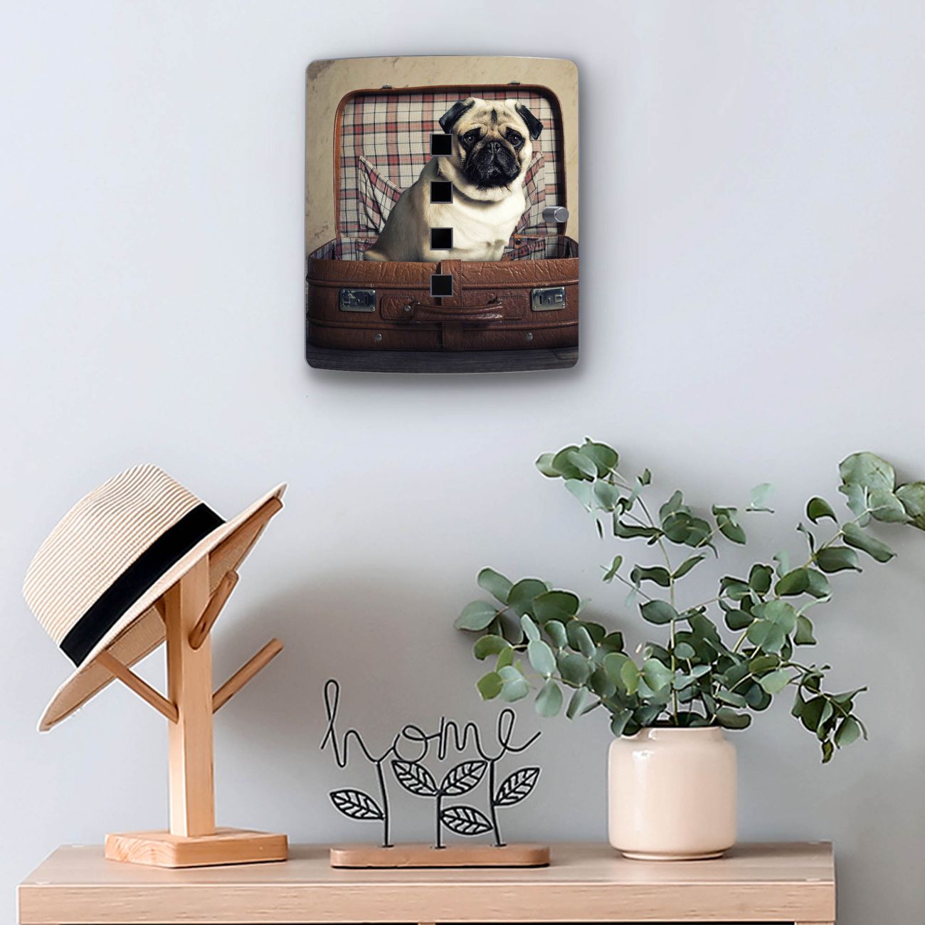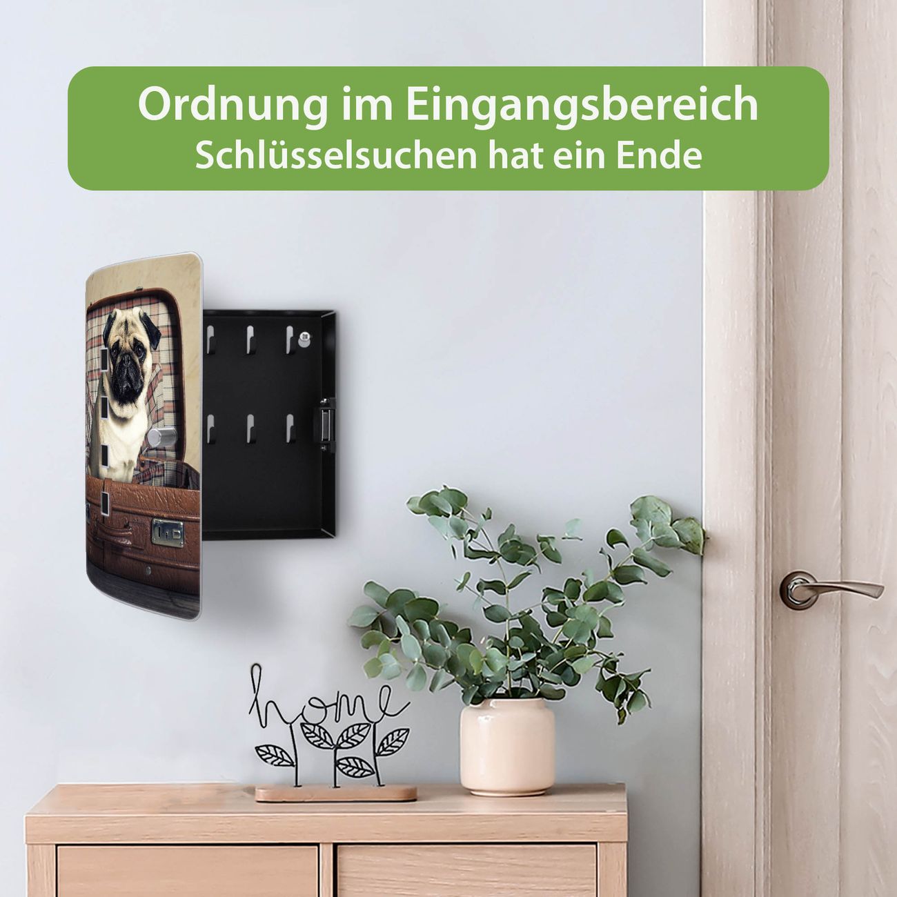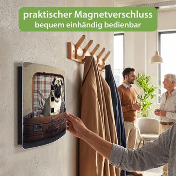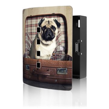 Funktion / Nutzen: Die leicht geschwungene Edelstahltür ist mit einer hochwertigen Motivfolie und dem Motiv Motiv Mops im Koffer kaschiert. Ein praktischer Magnetverschluss ermöglicht Ihnen ein schnelles Öffnen und Schließen. Befestigt wird der Schlüsselkasten an 2 Stellen auf der Rückseite, passendes Montagematerial fügen wir bereits bei.
