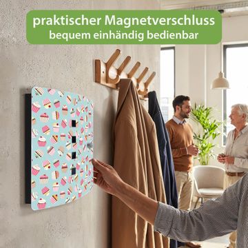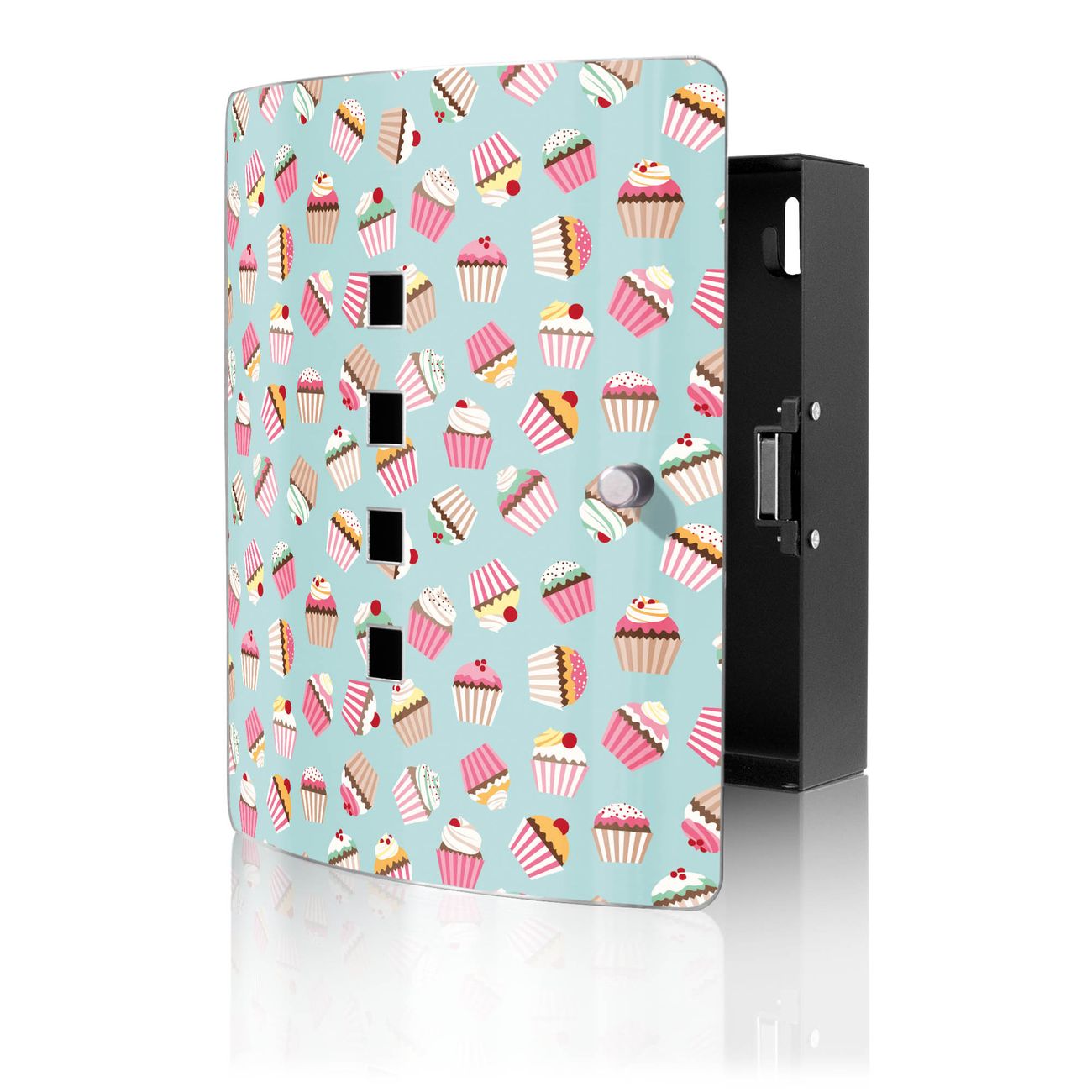 Funktion / Nutzen: Die leicht geschwungene Edelstahltür ist mit einer hochwertigen Motivfolie und dem Motiv Motiv Muffins kaschiert. Ein praktischer Magnetverschluss ermöglicht Ihnen ein schnelles Öffnen und Schließen. Befestigt wird der Schlüsselkasten an 2 Stellen auf der Rückseite, passendes Montagematerial fügen wir bereits bei.