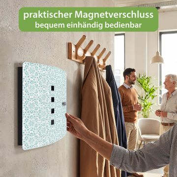 Funktion / Nutzen: Die leicht geschwungene Edelstahltür ist mit einer hochwertigen Motivfolie und dem Motiv Motiv Muster Getupft Blau kaschiert. Ein praktischer Magnetverschluss ermöglicht Ihnen ein schnelles Öffnen und Schließen. Befestigt wird der Schlüsselkasten an 2 Stellen auf der Rückseite, passendes Montagematerial fügen wir bereits bei.