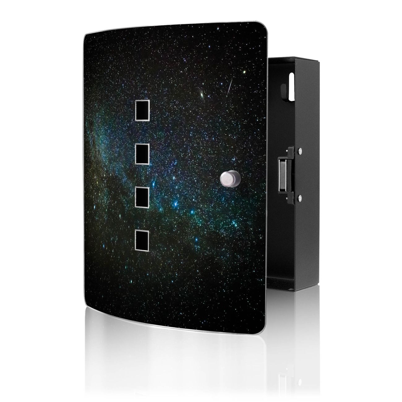 Funktion / Nutzen: Die leicht geschwungene Edelstahltür ist mit einer hochwertigen Motivfolie und dem Motiv Motiv Nachthimmel kaschiert. Ein praktischer Magnetverschluss ermöglicht Ihnen ein schnelles Öffnen und Schließen. Befestigt wird der Schlüsselkasten an 2 Stellen auf der Rückseite, passendes Montagematerial fügen wir bereits bei.
