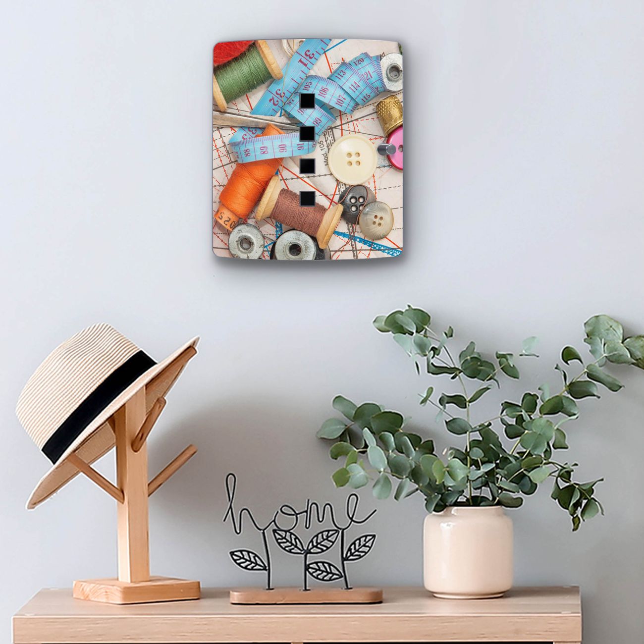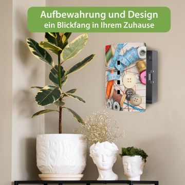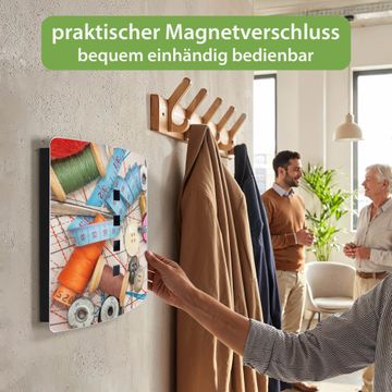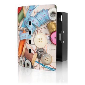 Funktion / Nutzen: Die leicht geschwungene Edelstahltür ist mit einer hochwertigen Motivfolie und dem Motiv Motiv Nähen kaschiert. Ein praktischer Magnetverschluss ermöglicht Ihnen ein schnelles Öffnen und Schließen. Befestigt wird der Schlüsselkasten an 2 Stellen auf der Rückseite, passendes Montagematerial fügen wir bereits bei.