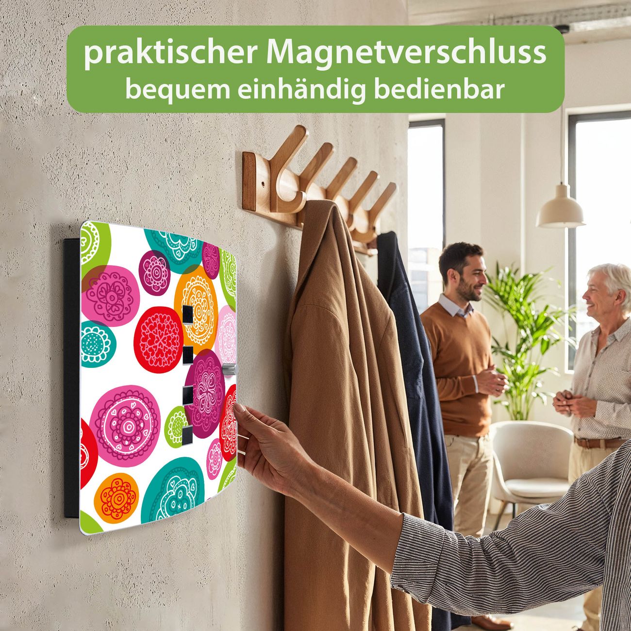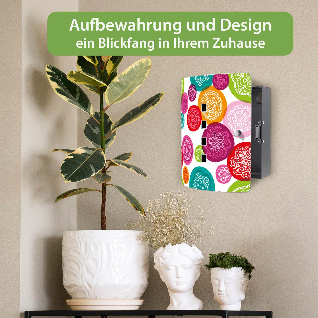 Funktion / Nutzen: Die leicht geschwungene Edelstahltür ist mit einer hochwertigen Motivfolie und dem Motiv Motiv Naive Blüten kaschiert. Ein praktischer Magnetverschluss ermöglicht Ihnen ein schnelles Öffnen und Schließen. Befestigt wird der Schlüsselkasten an 2 Stellen auf der Rückseite, passendes Montagematerial fügen wir bereits bei.