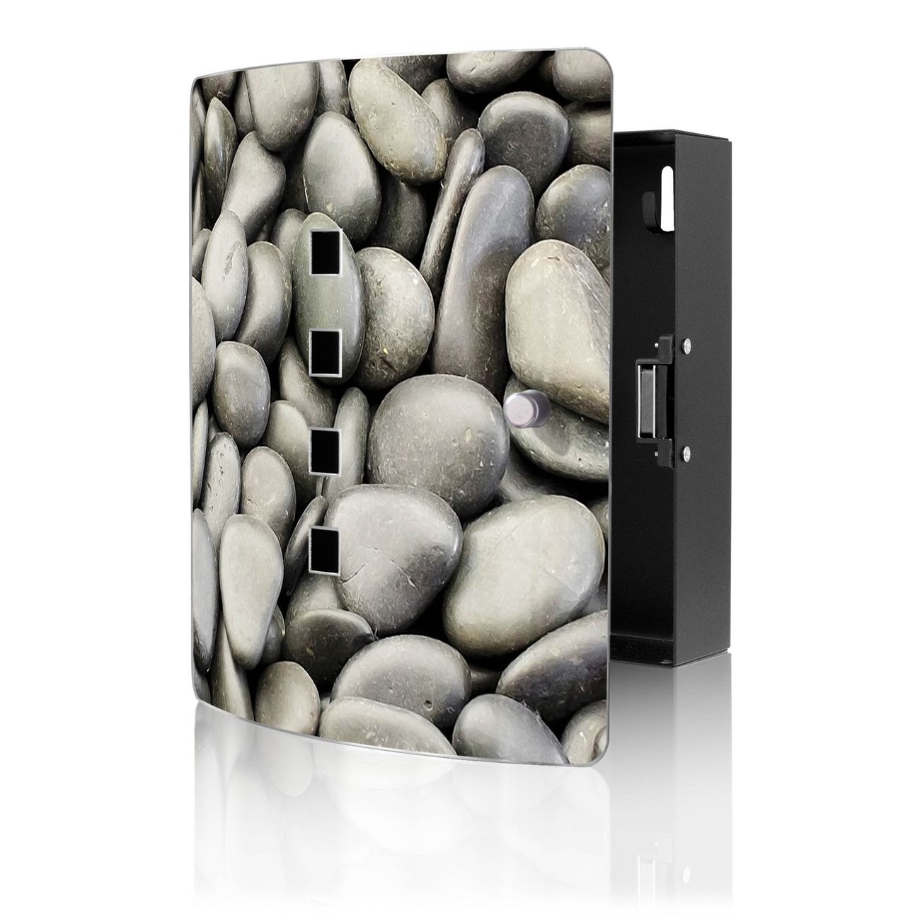 Funktion / Nutzen: Die leicht geschwungene Edelstahltür ist mit einer hochwertigen Motivfolie und dem Motiv Motiv Nasse Kiesel kaschiert. Ein praktischer Magnetverschluss ermöglicht Ihnen ein schnelles Öffnen und Schließen. Befestigt wird der Schlüsselkasten an 2 Stellen auf der Rückseite, passendes Montagematerial fügen wir bereits bei.