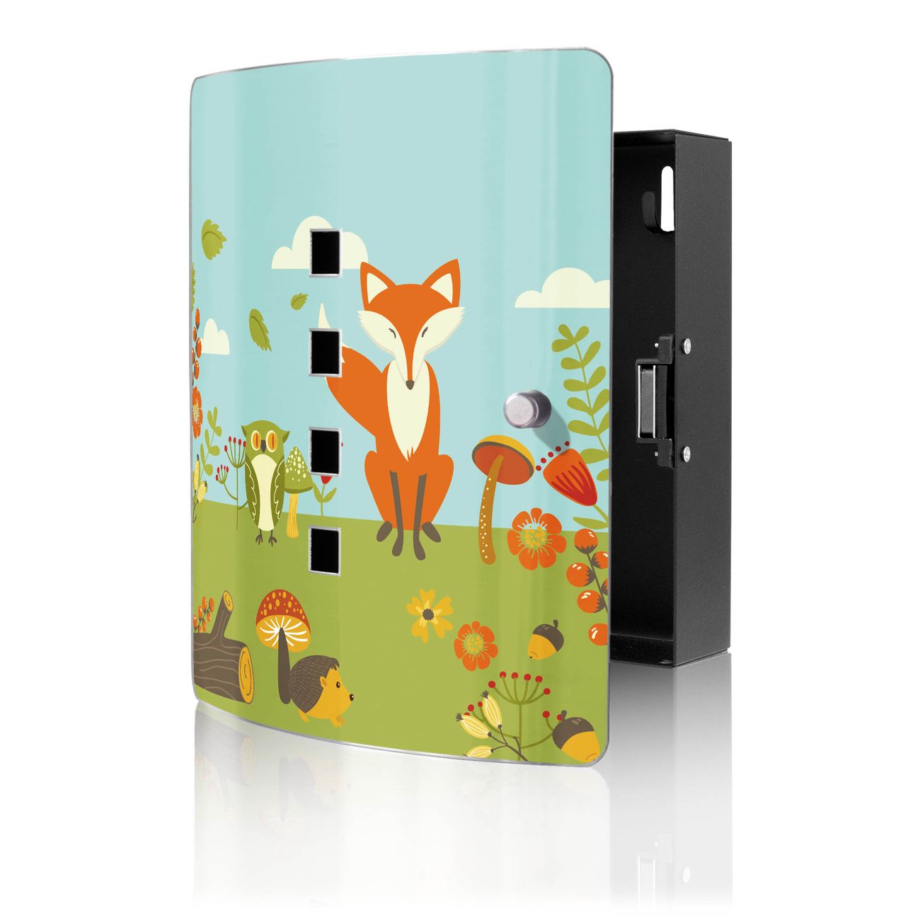 Funktion / Nutzen: Die leicht geschwungene Edelstahltür ist mit einer hochwertigen Motivfolie und dem Motiv Motiv Neulich Im Wald kaschiert. Ein praktischer Magnetverschluss ermöglicht Ihnen ein schnelles Öffnen und Schließen. Befestigt wird der Schlüsselkasten an 2 Stellen auf der Rückseite, passendes Montagematerial fügen wir bereits bei.