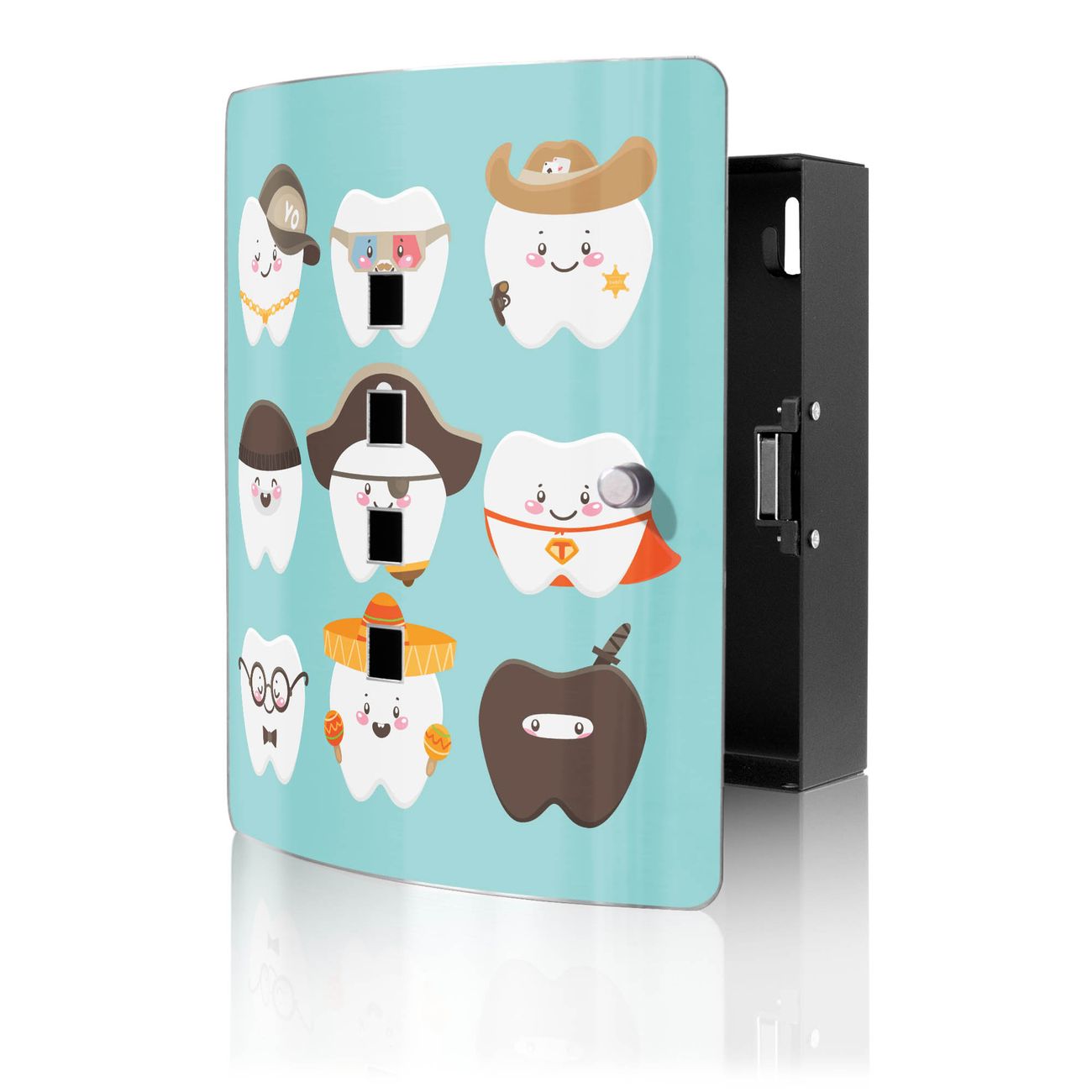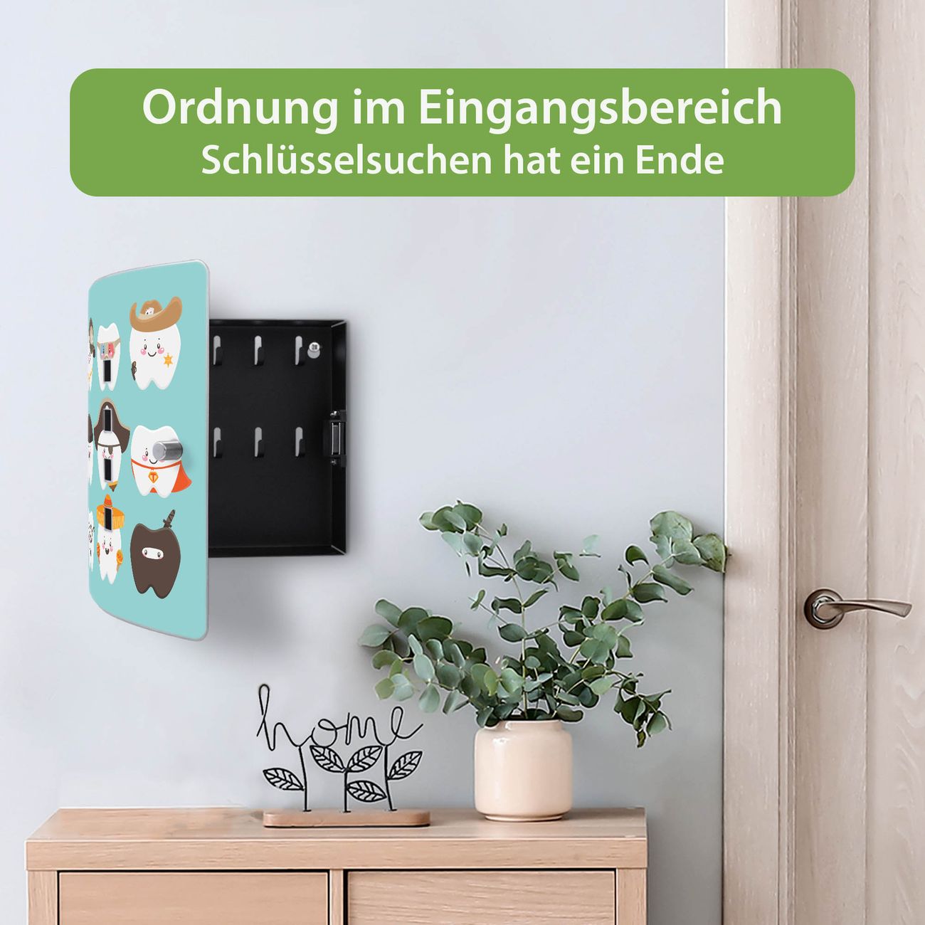 Funktion / Nutzen: Die leicht geschwungene Edelstahltür ist mit einer hochwertigen Motivfolie und dem Motiv Motiv Neun Zähne kaschiert. Ein praktischer Magnetverschluss ermöglicht Ihnen ein schnelles Öffnen und Schließen. Befestigt wird der Schlüsselkasten an 2 Stellen auf der Rückseite, passendes Montagematerial fügen wir bereits bei.