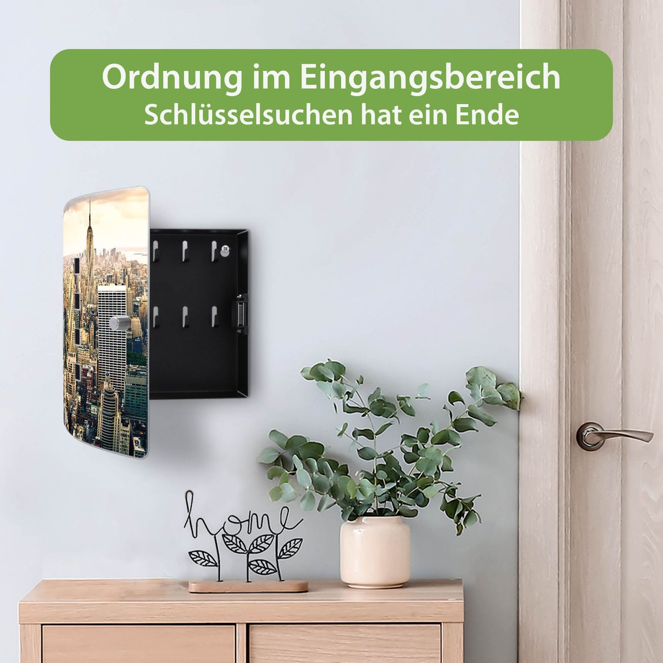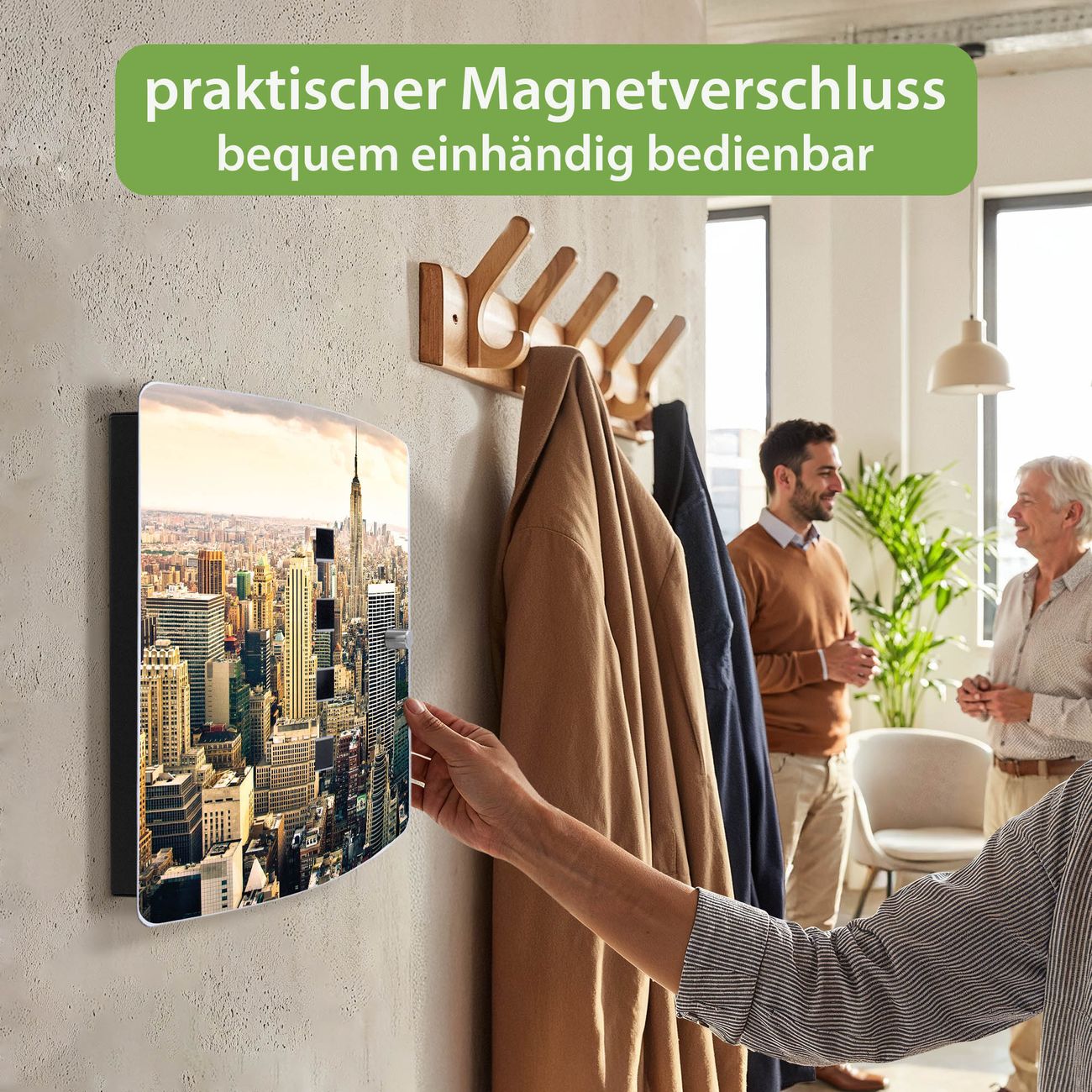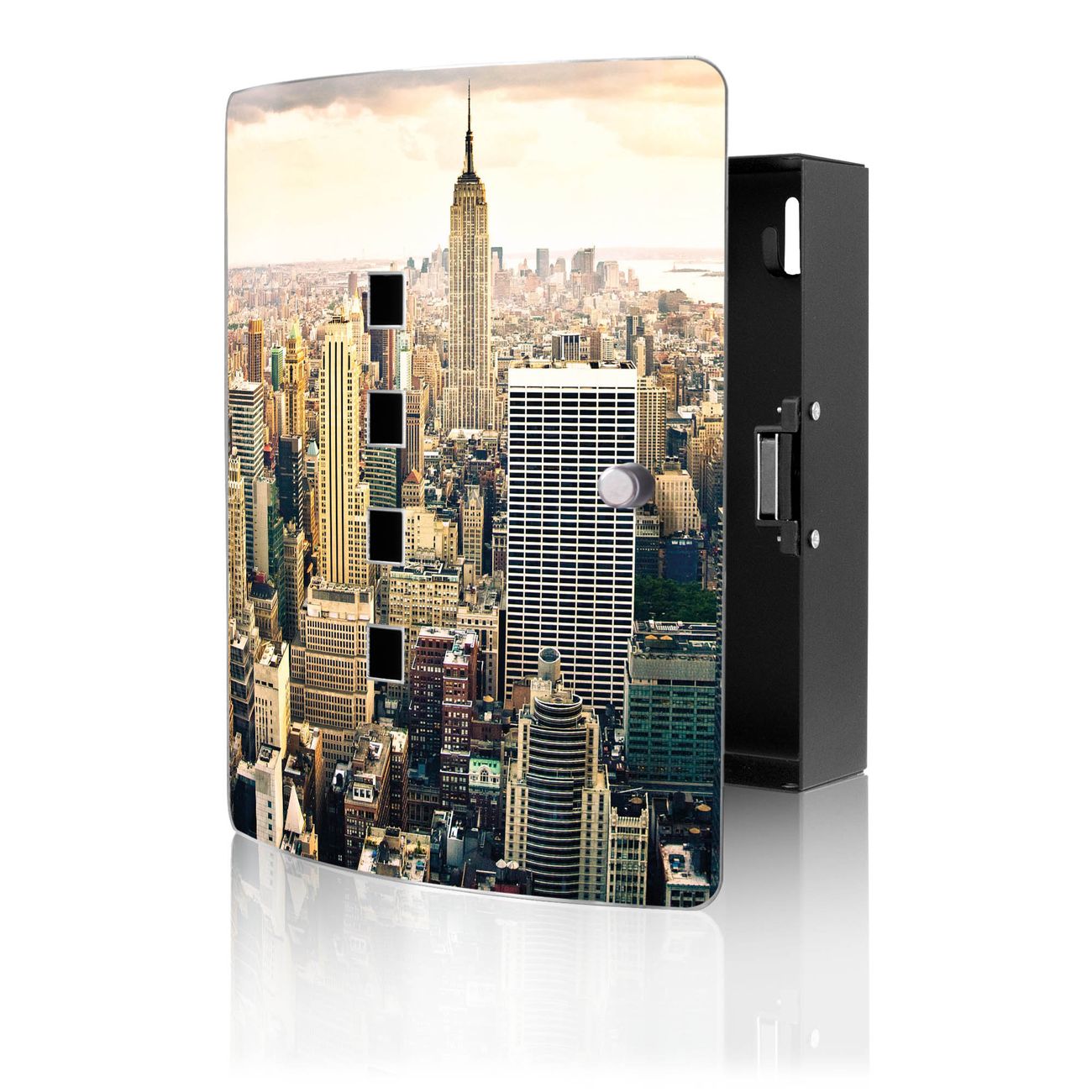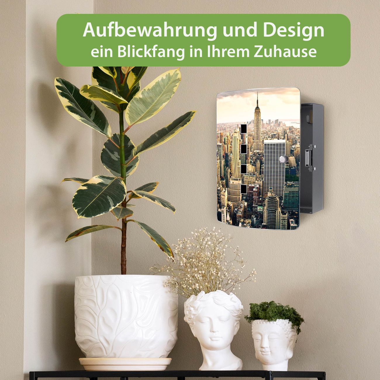 Funktion / Nutzen: Die leicht geschwungene Edelstahltür ist mit einer hochwertigen Motivfolie und dem Motiv Motiv New York City kaschiert. Ein praktischer Magnetverschluss ermöglicht Ihnen ein schnelles Öffnen und Schließen. Befestigt wird der Schlüsselkasten an 2 Stellen auf der Rückseite, passendes Montagematerial fügen wir bereits bei.