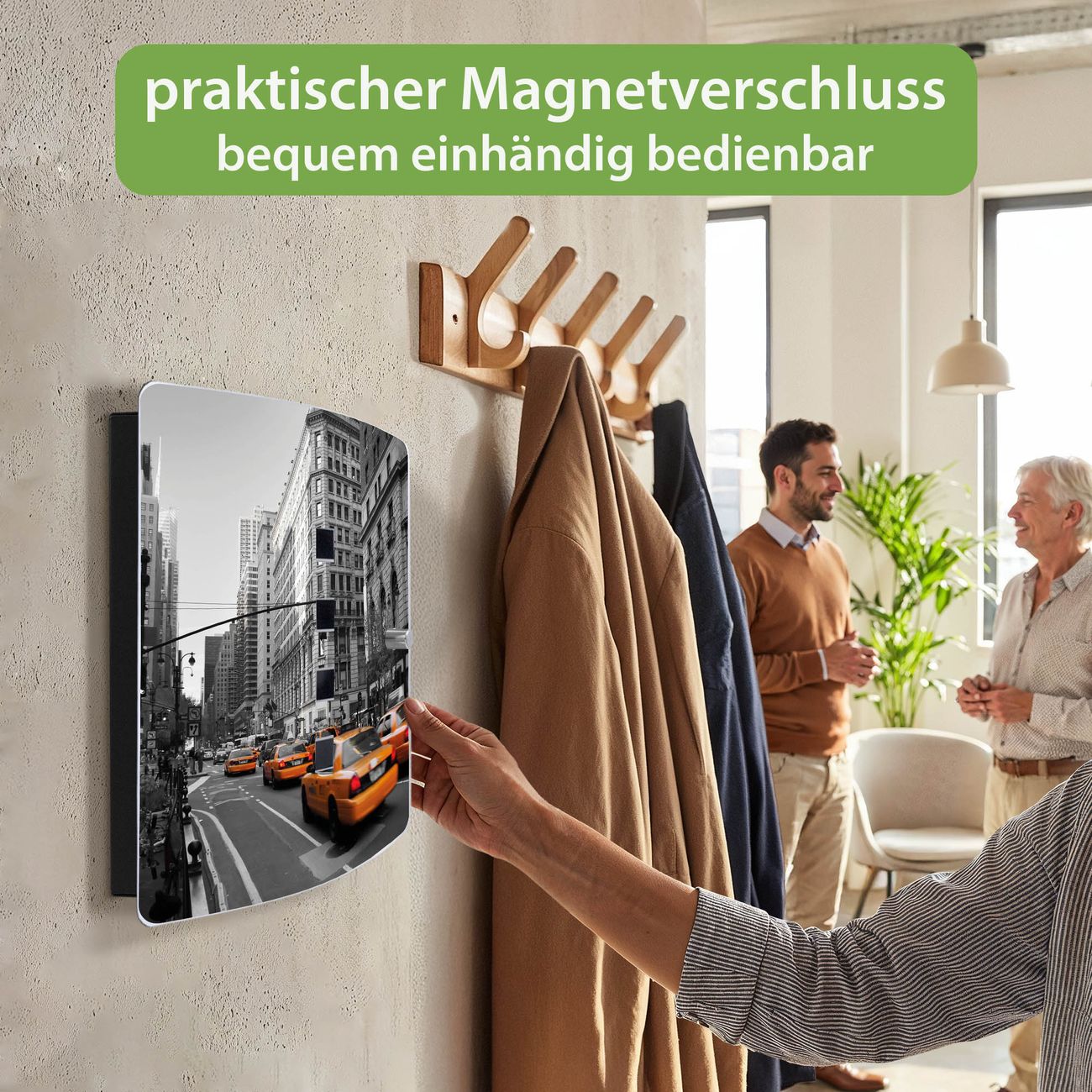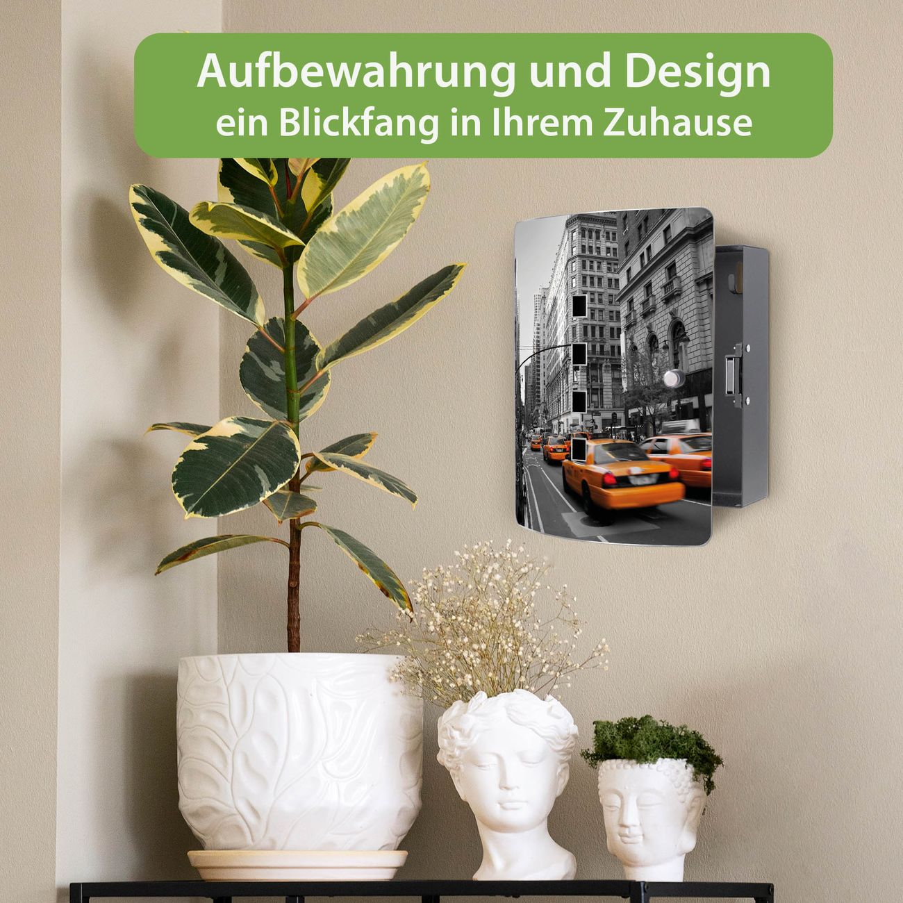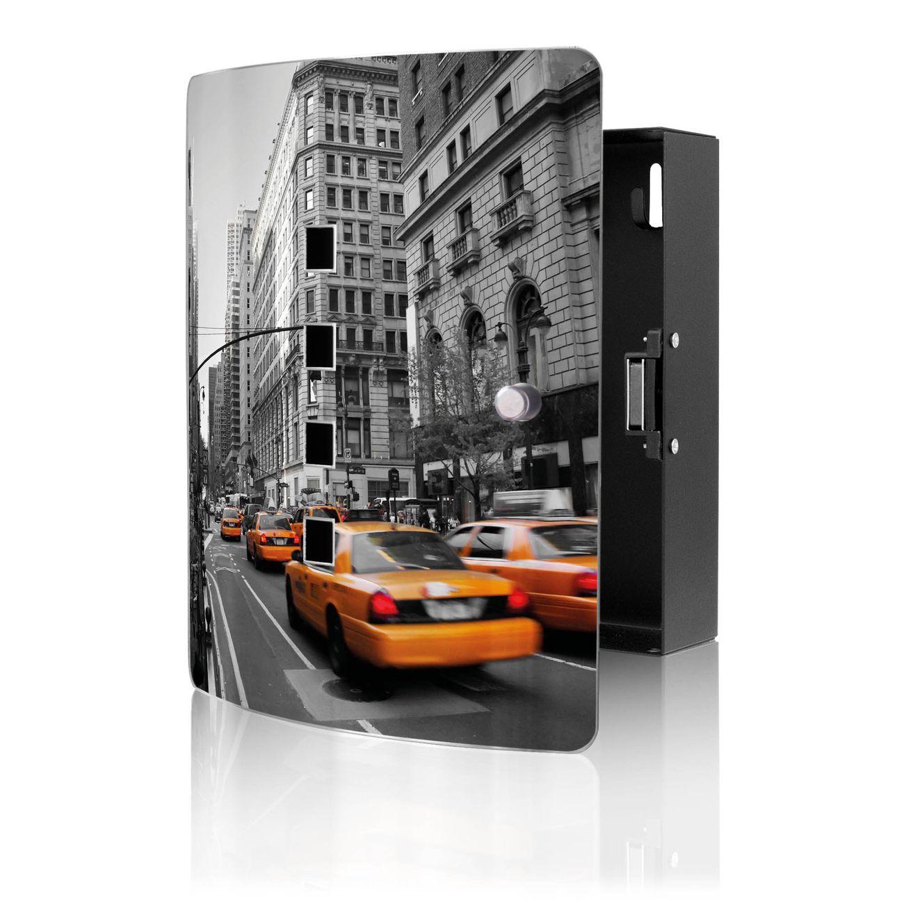 Funktion / Nutzen: Die leicht geschwungene Edelstahltür ist mit einer hochwertigen Motivfolie und dem Motiv Motiv New York Taxi kaschiert. Ein praktischer Magnetverschluss ermöglicht Ihnen ein schnelles Öffnen und Schließen. Befestigt wird der Schlüsselkasten an 2 Stellen auf der Rückseite, passendes Montagematerial fügen wir bereits bei.
