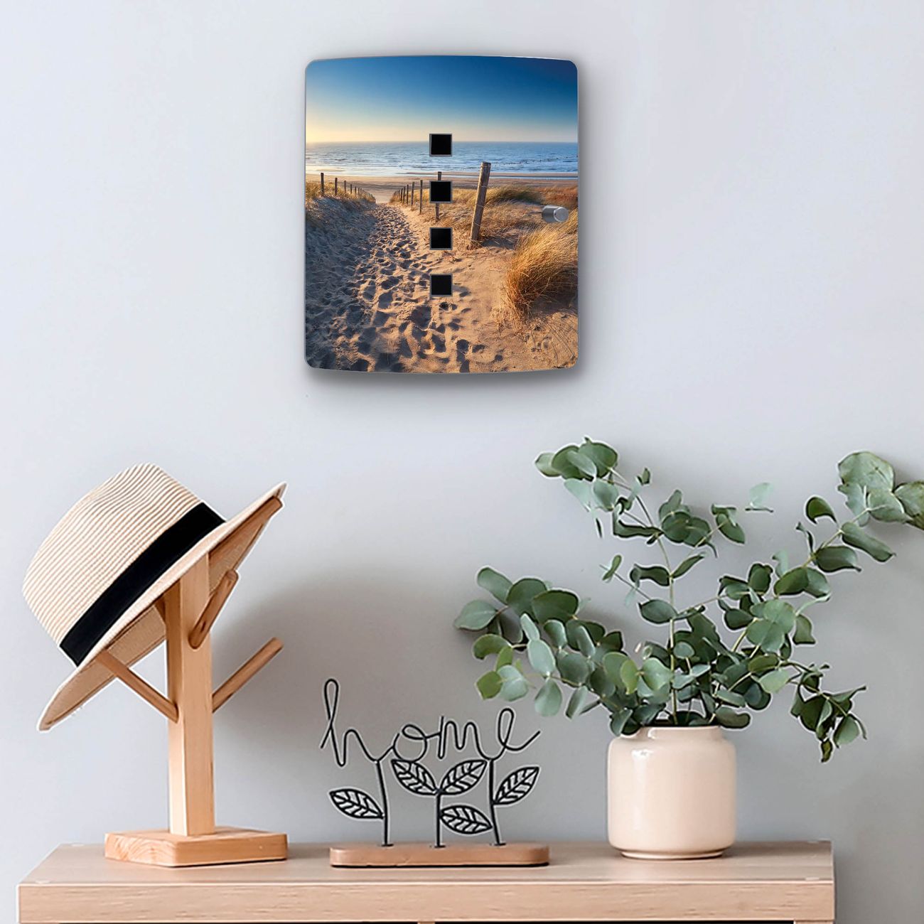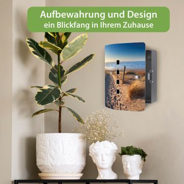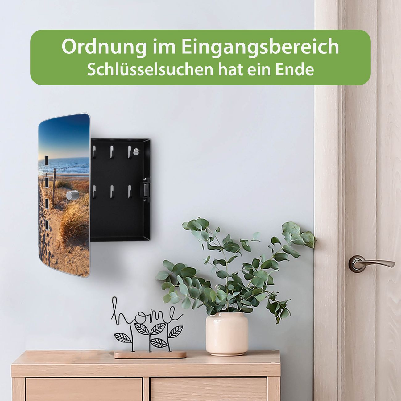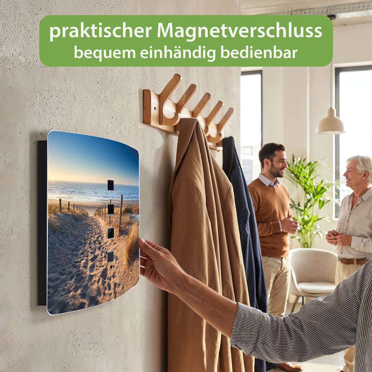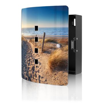 Funktion / Nutzen: Die leicht geschwungene Edelstahltür ist mit einer hochwertigen Motivfolie und dem Motiv Motiv Nordseestrand kaschiert. Ein praktischer Magnetverschluss ermöglicht Ihnen ein schnelles Öffnen und Schließen. Befestigt wird der Schlüsselkasten an 2 Stellen auf der Rückseite, passendes Montagematerial fügen wir bereits bei.