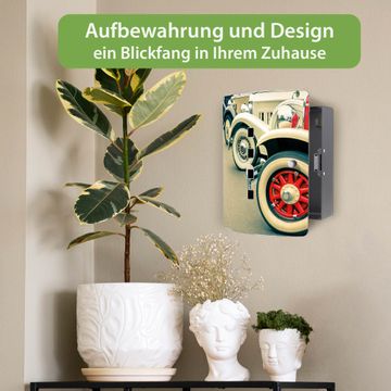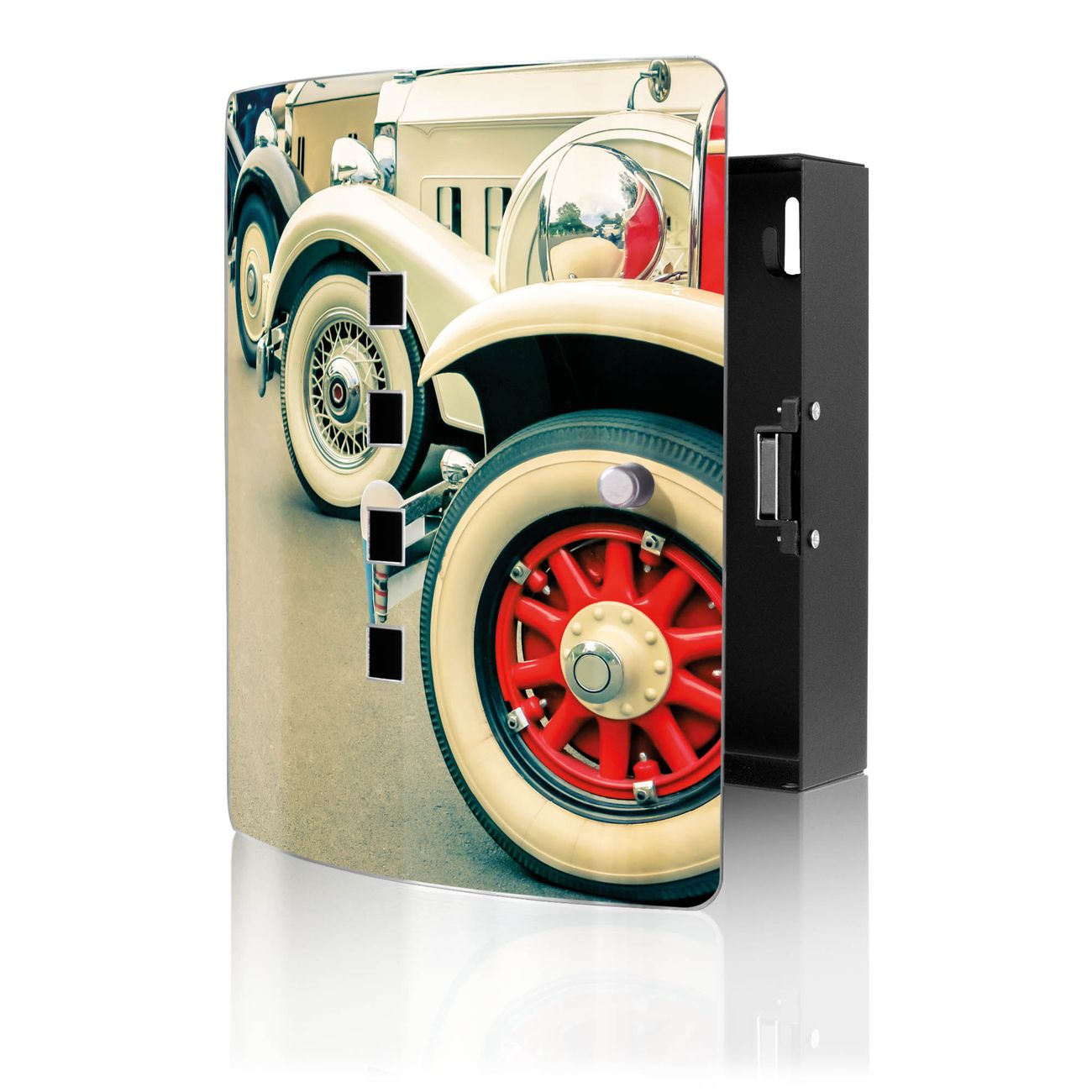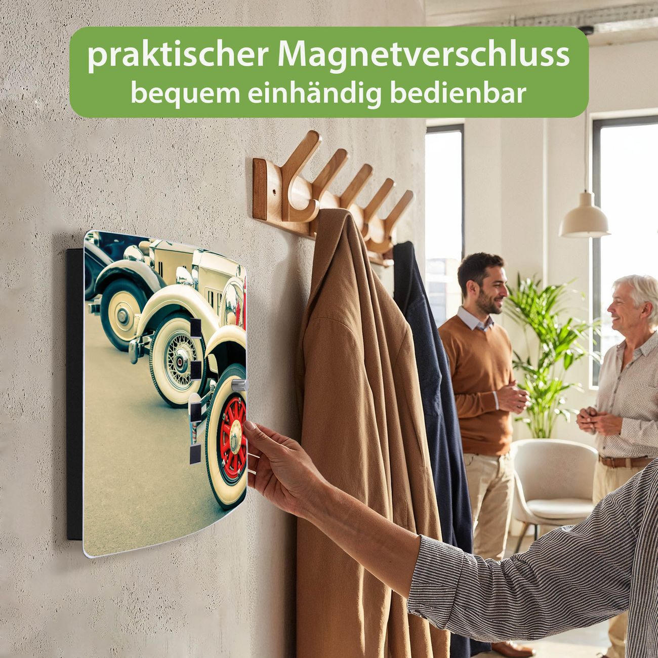 Funktion / Nutzen: Die leicht geschwungene Edelstahltür ist mit einer hochwertigen Motivfolie und dem Motiv Motiv Oldtimer Räder kaschiert. Ein praktischer Magnetverschluss ermöglicht Ihnen ein schnelles Öffnen und Schließen. Befestigt wird der Schlüsselkasten an 2 Stellen auf der Rückseite, passendes Montagematerial fügen wir bereits bei.