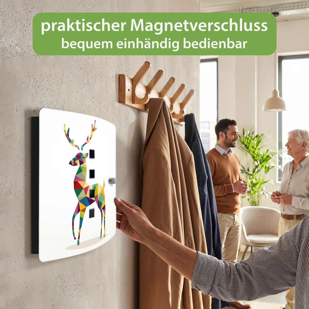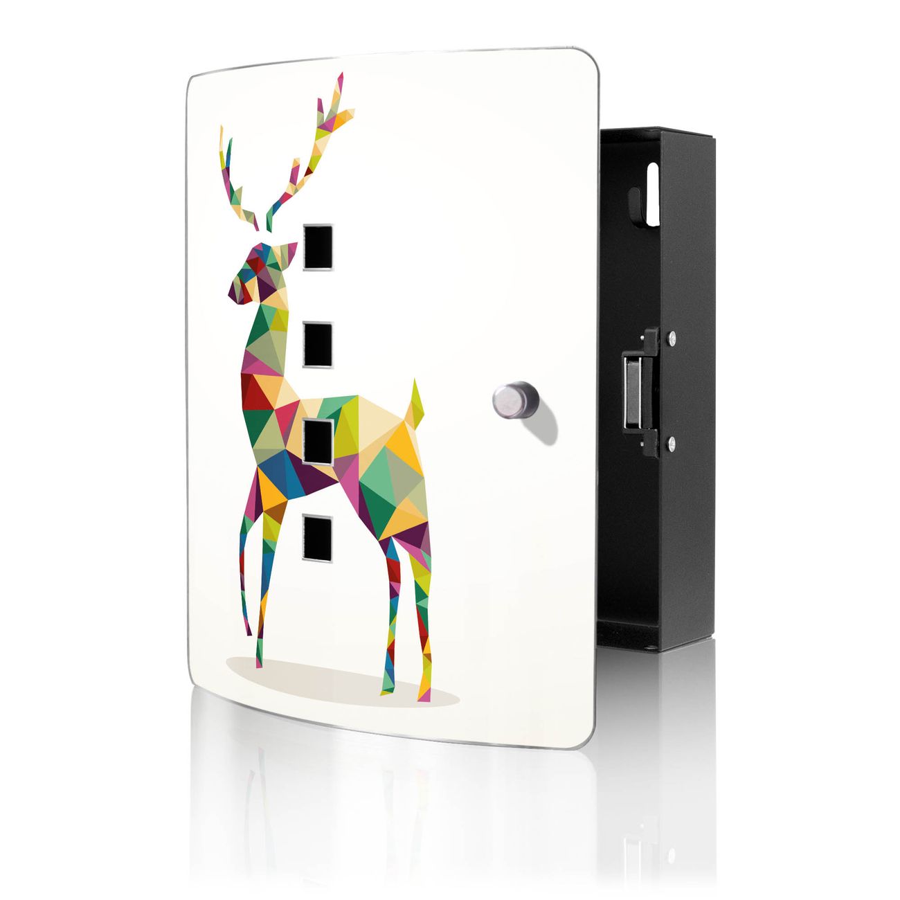 Funktion / Nutzen: Die leicht geschwungene Edelstahltür ist mit einer hochwertigen Motivfolie und dem Motiv Motiv Origami Hirsch kaschiert. Ein praktischer Magnetverschluss ermöglicht Ihnen ein schnelles Öffnen und Schließen. Befestigt wird der Schlüsselkasten an 2 Stellen auf der Rückseite, passendes Montagematerial fügen wir bereits bei.