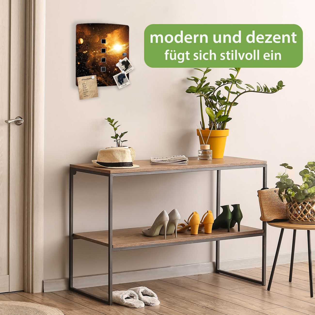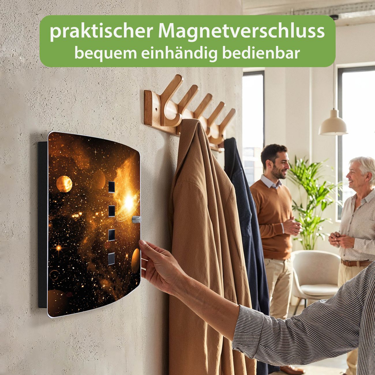 Funktion / Nutzen: Die leicht geschwungene Edelstahltür ist mit einer hochwertigen Motivfolie und dem Motiv Motiv Outer Space kaschiert. Ein praktischer Magnetverschluss ermöglicht Ihnen ein schnelles Öffnen und Schließen. Befestigt wird der Schlüsselkasten an 2 Stellen auf der Rückseite, passendes Montagematerial fügen wir bereits bei.