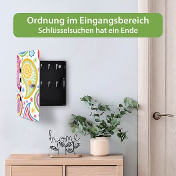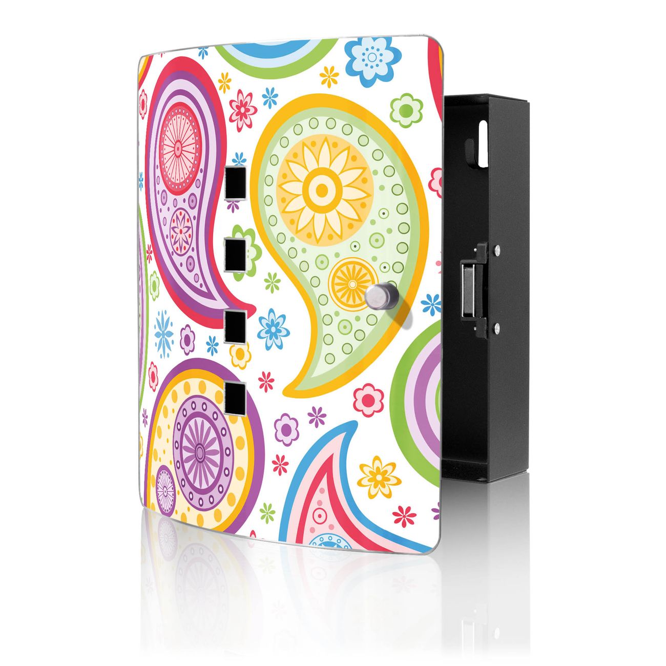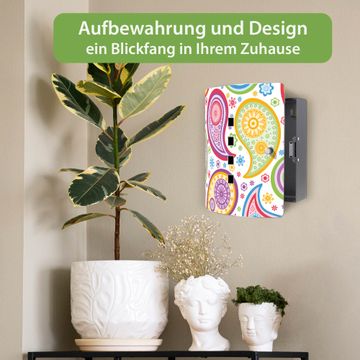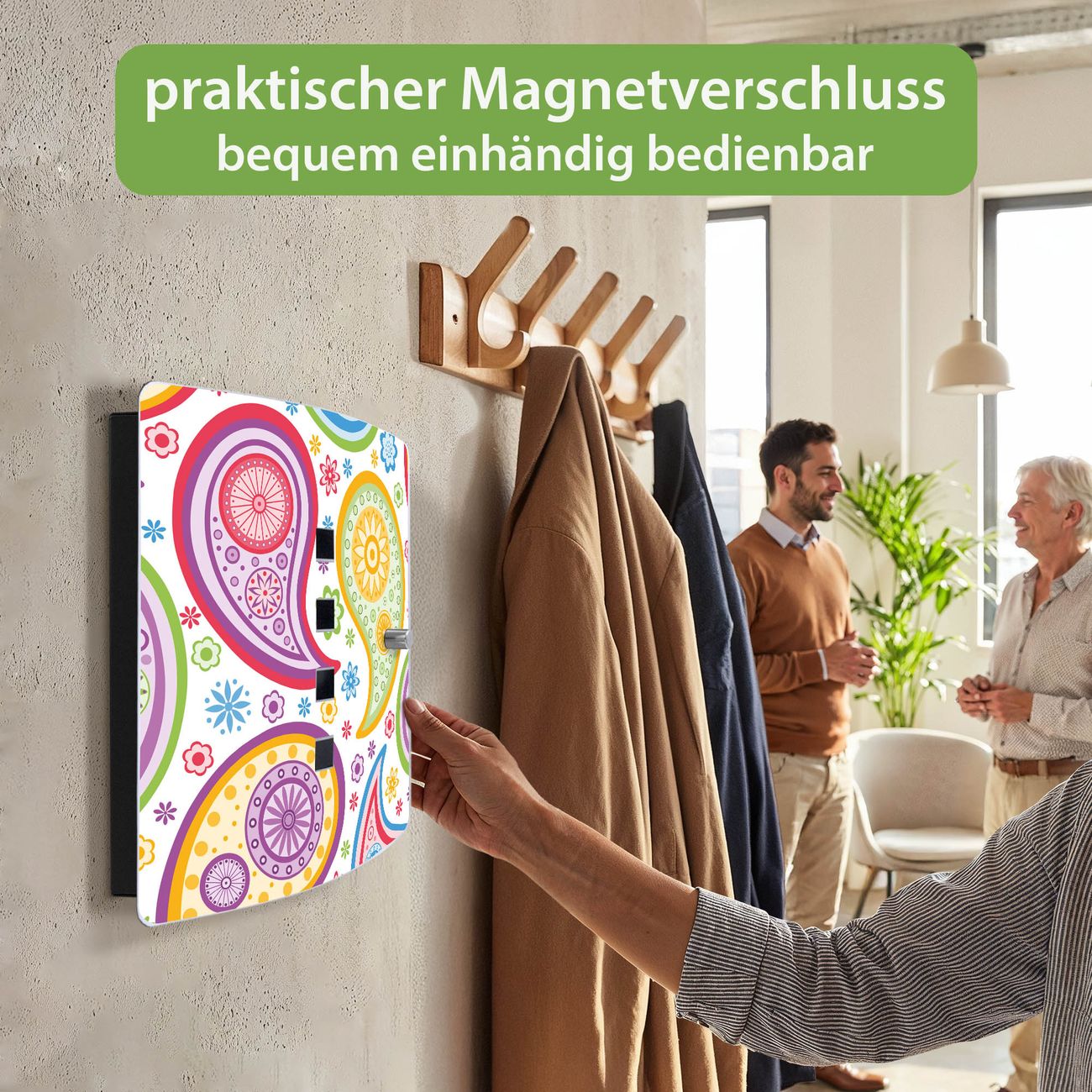 Funktion / Nutzen: Die leicht geschwungene Edelstahltür ist mit einer hochwertigen Motivfolie und dem Motiv Motiv Paisley bunt kaschiert. Ein praktischer Magnetverschluss ermöglicht Ihnen ein schnelles Öffnen und Schließen. Befestigt wird der Schlüsselkasten an 2 Stellen auf der Rückseite, passendes Montagematerial fügen wir bereits bei.