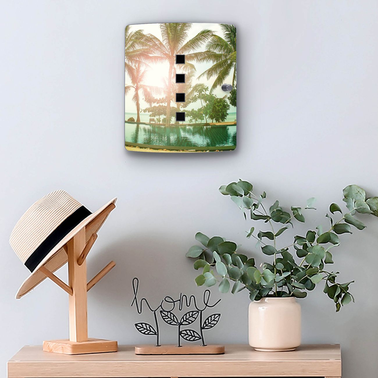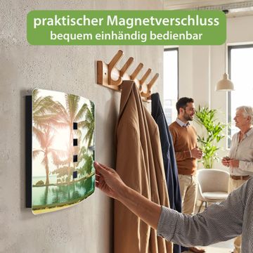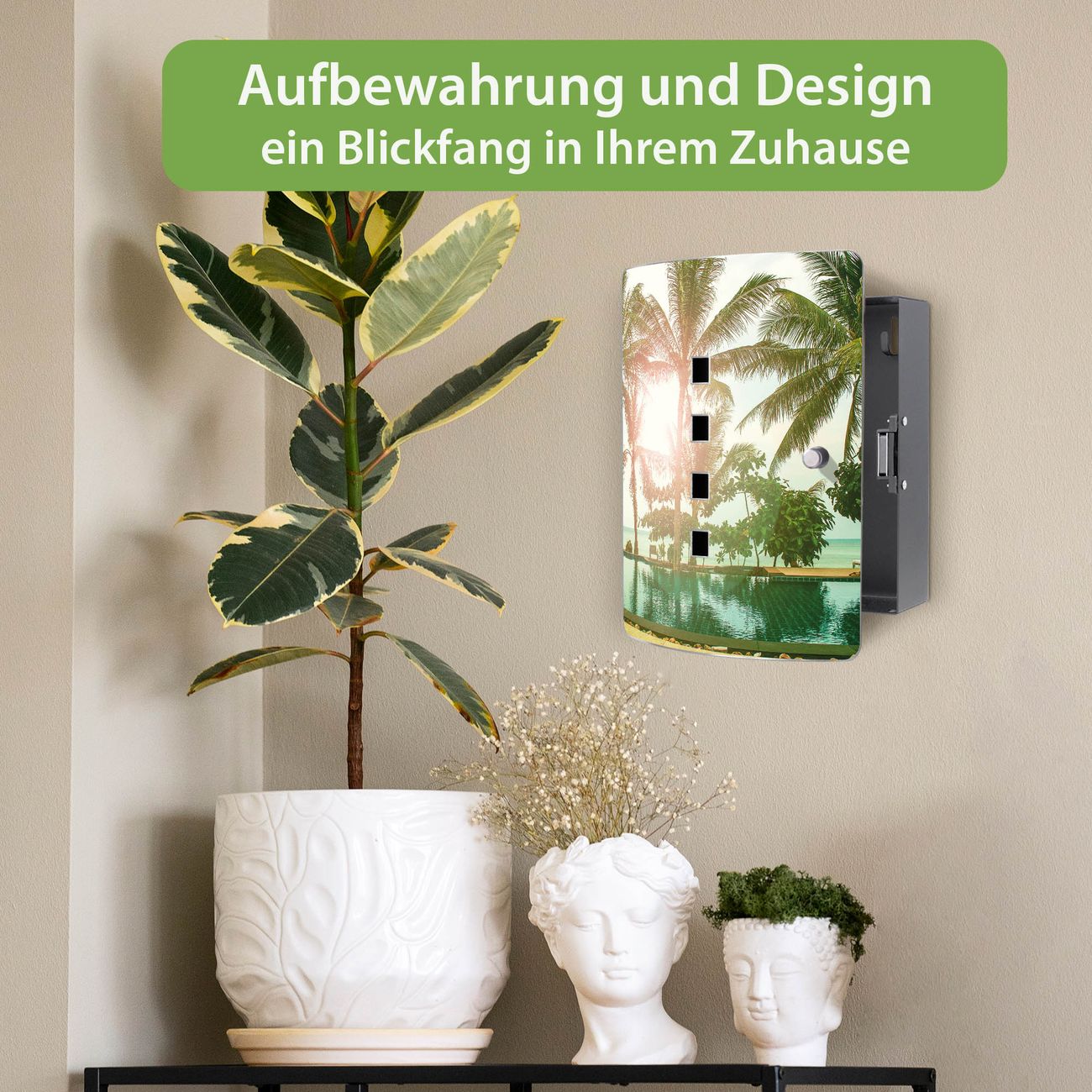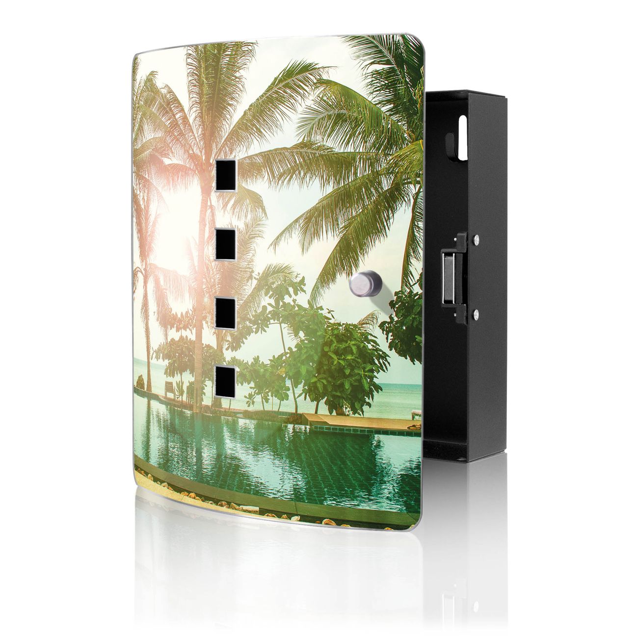 Funktion / Nutzen: Die leicht geschwungene Edelstahltür ist mit einer hochwertigen Motivfolie und dem Motiv Motiv Palmen kaschiert. Ein praktischer Magnetverschluss ermöglicht Ihnen ein schnelles Öffnen und Schließen. Befestigt wird der Schlüsselkasten an 2 Stellen auf der Rückseite, passendes Montagematerial fügen wir bereits bei.