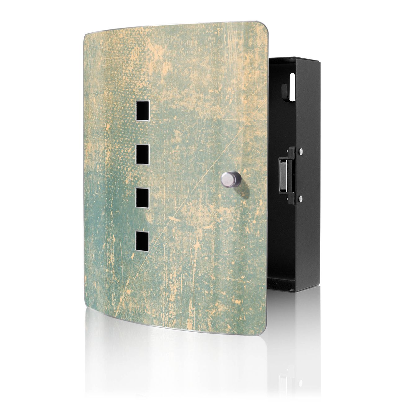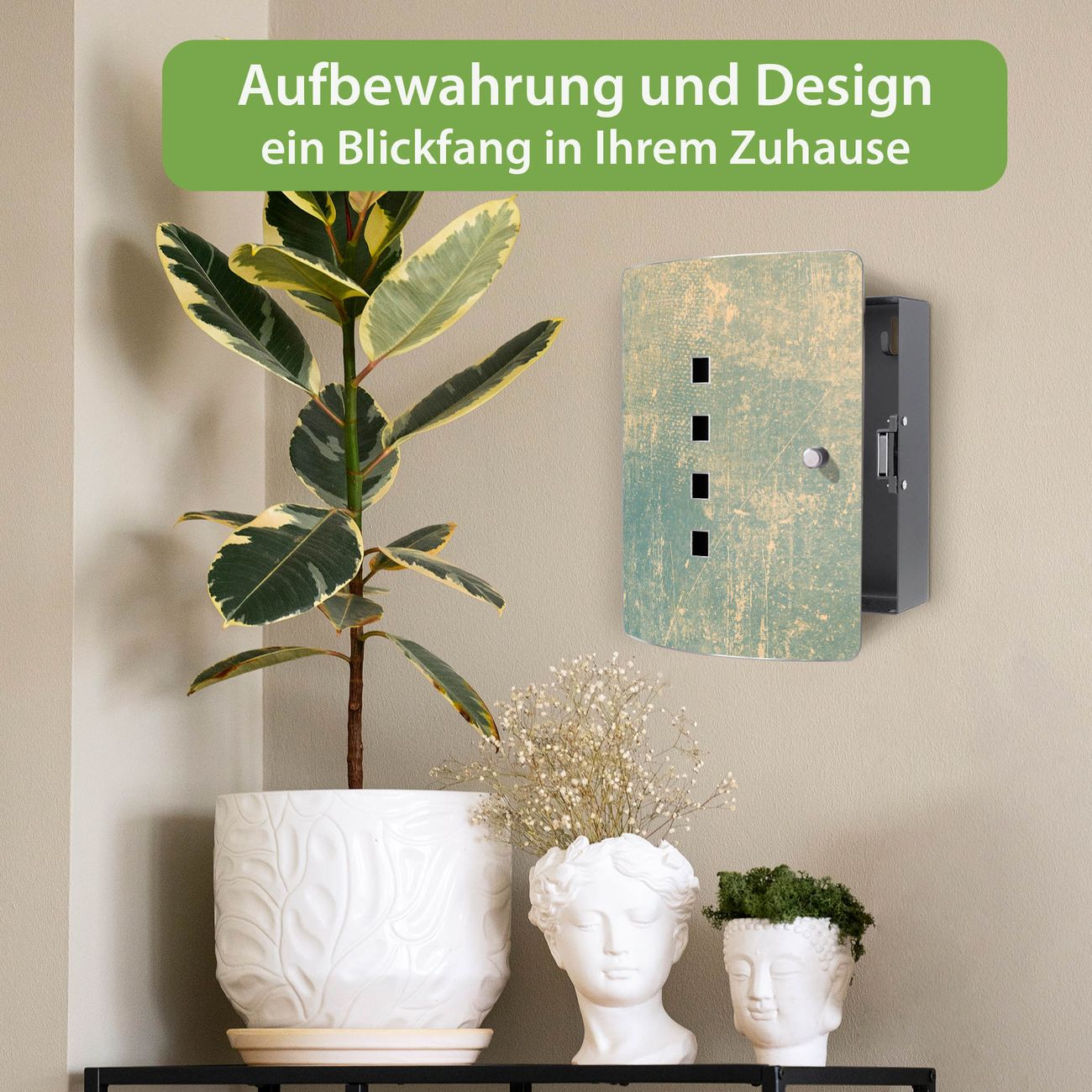 Funktion / Nutzen: Die leicht geschwungene Edelstahltür ist mit einer hochwertigen Motivfolie und dem Motiv Motiv Patina Grün kaschiert. Ein praktischer Magnetverschluss ermöglicht Ihnen ein schnelles Öffnen und Schließen. Befestigt wird der Schlüsselkasten an 2 Stellen auf der Rückseite, passendes Montagematerial fügen wir bereits bei.