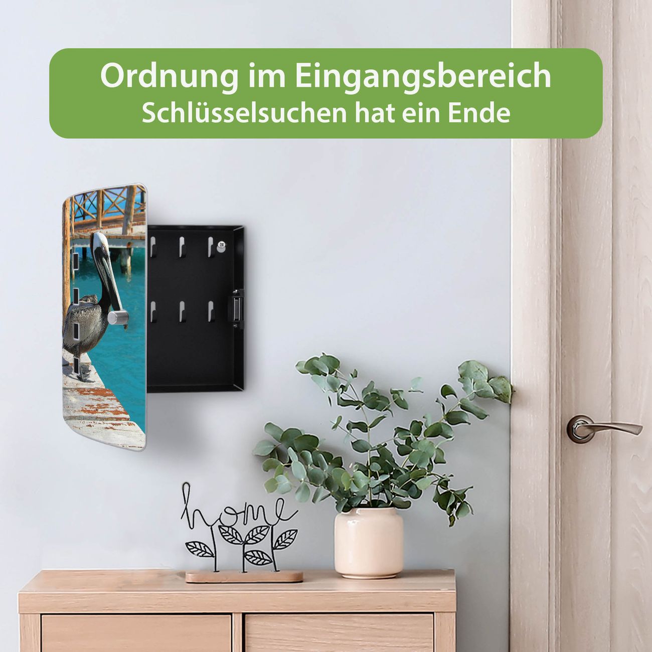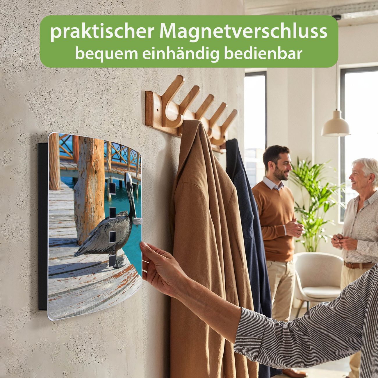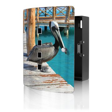 Funktion / Nutzen: Die leicht geschwungene Edelstahltür ist mit einer hochwertigen Motivfolie und dem Motiv Motiv Pelikan kaschiert. Ein praktischer Magnetverschluss ermöglicht Ihnen ein schnelles Öffnen und Schließen. Befestigt wird der Schlüsselkasten an 2 Stellen auf der Rückseite, passendes Montagematerial fügen wir bereits bei.