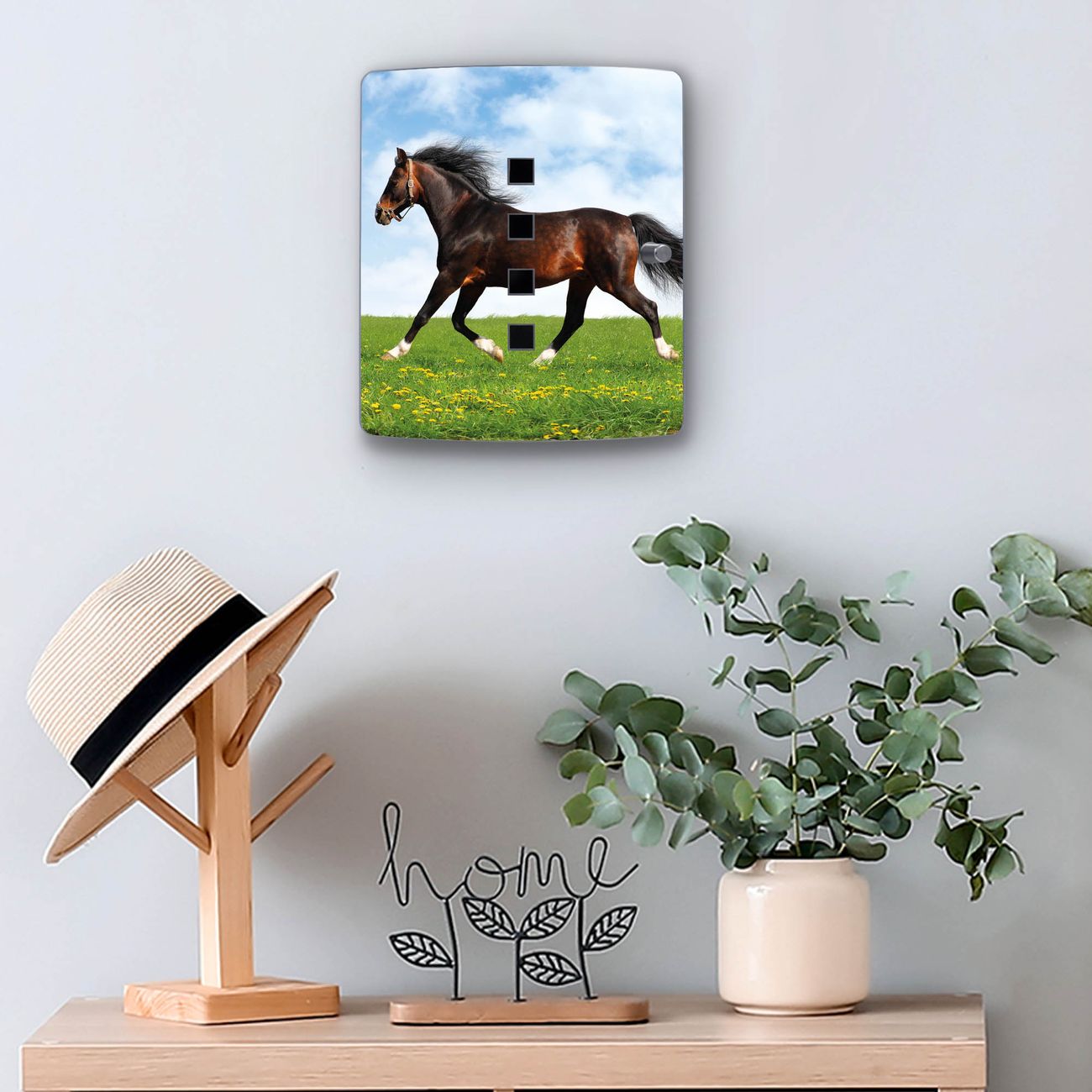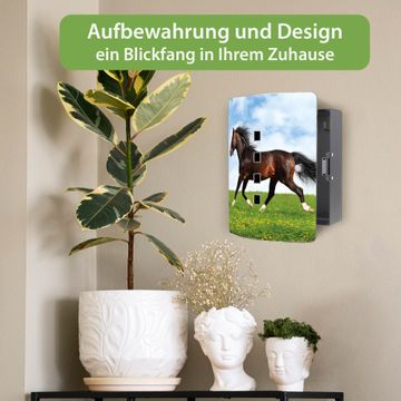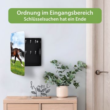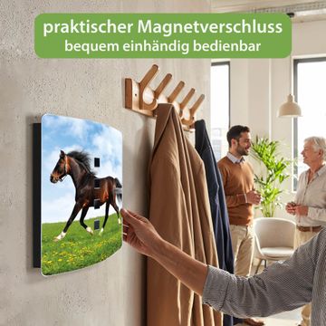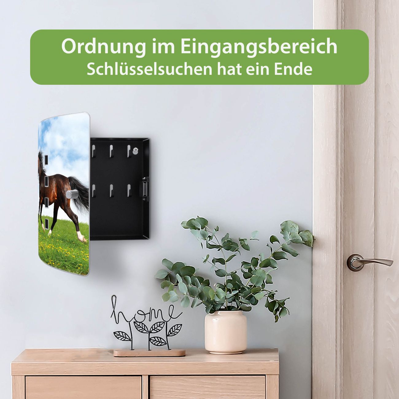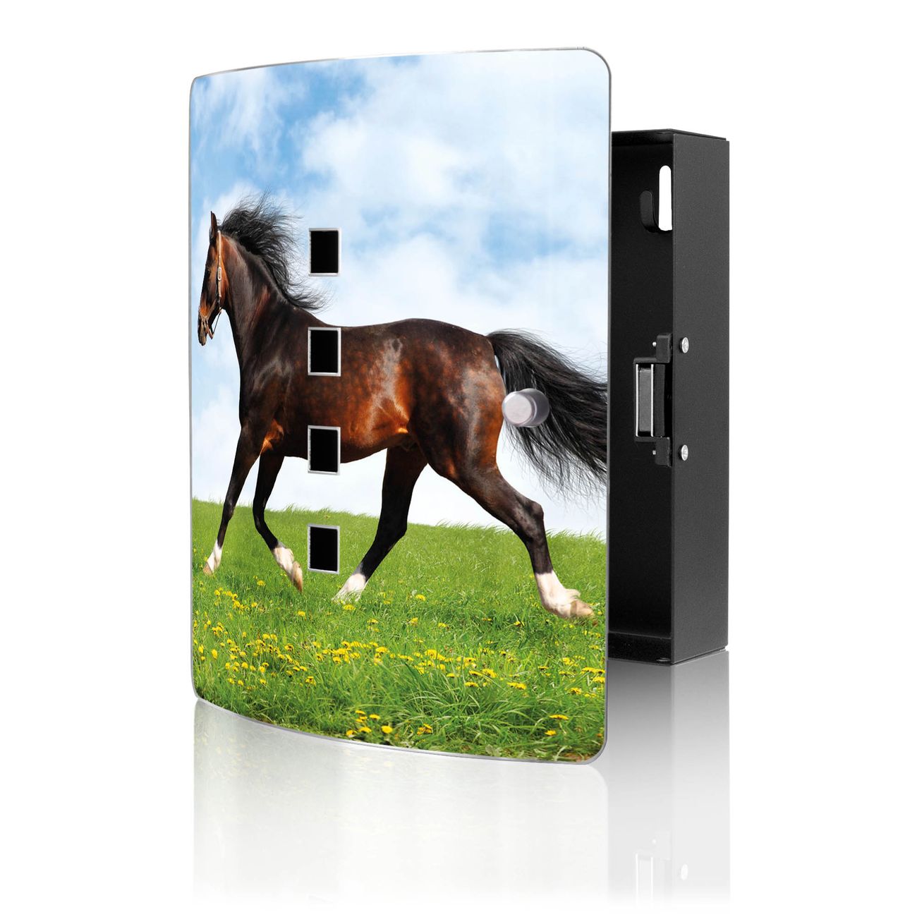 Funktion / Nutzen: Die leicht geschwungene Edelstahltür ist mit einer hochwertigen Motivfolie und dem Motiv Motiv Pferd kaschiert. Ein praktischer Magnetverschluss ermöglicht Ihnen ein schnelles Öffnen und Schließen. Befestigt wird der Schlüsselkasten an 2 Stellen auf der Rückseite, passendes Montagematerial fügen wir bereits bei.