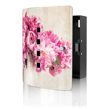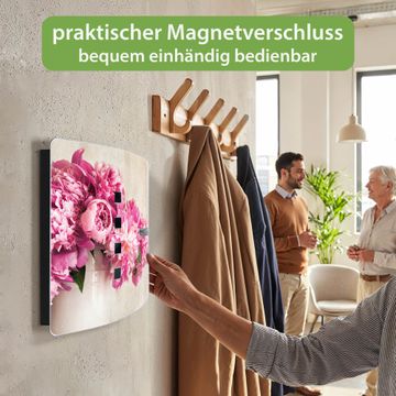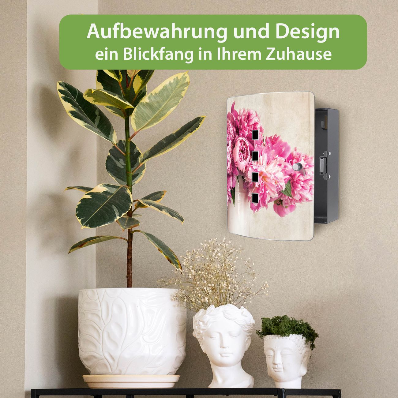 Funktion / Nutzen: Die leicht geschwungene Edelstahltür ist mit einer hochwertigen Motivfolie und dem Motiv Motiv Pfingstrose kaschiert. Ein praktischer Magnetverschluss ermöglicht Ihnen ein schnelles Öffnen und Schließen. Befestigt wird der Schlüsselkasten an 2 Stellen auf der Rückseite, passendes Montagematerial fügen wir bereits bei.