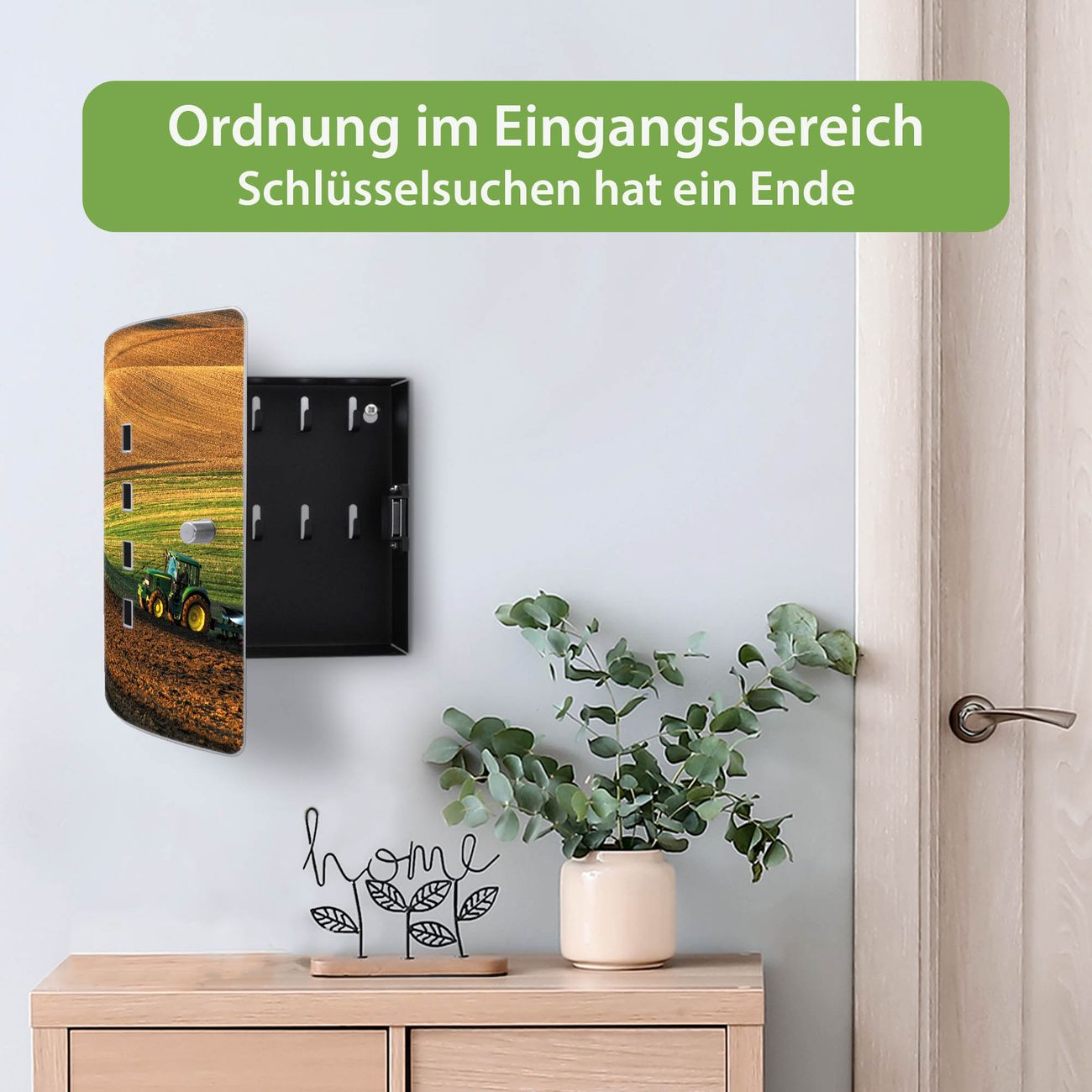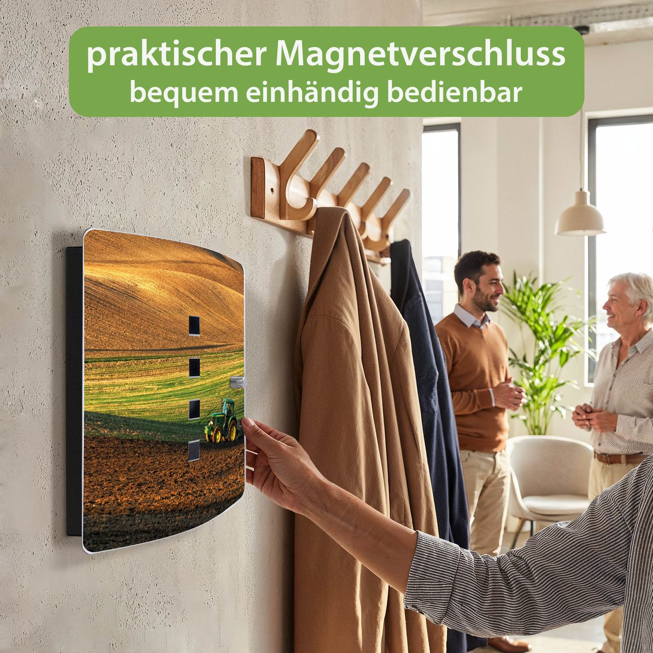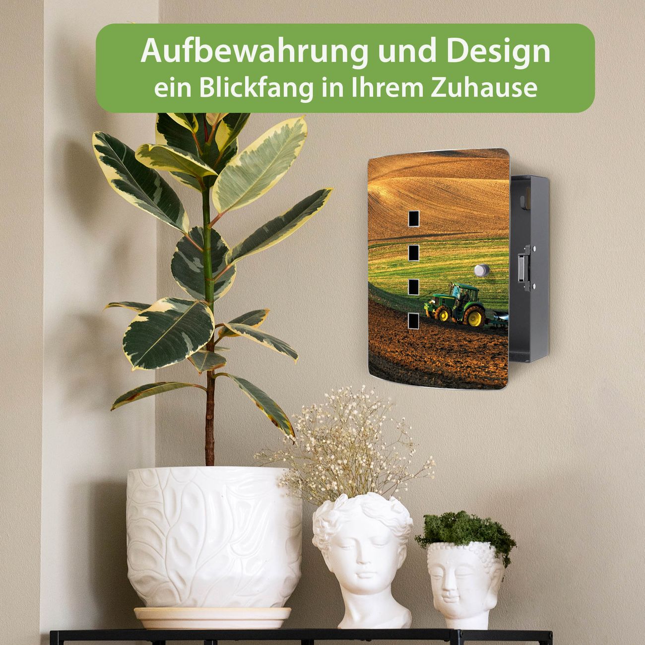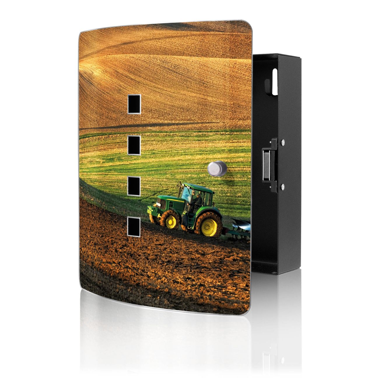 Funktion / Nutzen: Die leicht geschwungene Edelstahltür ist mit einer hochwertigen Motivfolie und dem Motiv Motiv Pflügen kaschiert. Ein praktischer Magnetverschluss ermöglicht Ihnen ein schnelles Öffnen und Schließen. Befestigt wird der Schlüsselkasten an 2 Stellen auf der Rückseite, passendes Montagematerial fügen wir bereits bei.