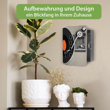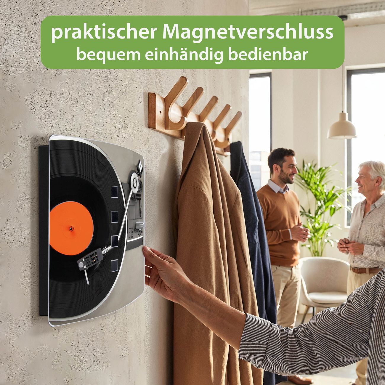 Funktion / Nutzen: Die leicht geschwungene Edelstahltür ist mit einer hochwertigen Motivfolie und dem Motiv Motiv Plattenspieler kaschiert. Ein praktischer Magnetverschluss ermöglicht Ihnen ein schnelles Öffnen und Schließen. Befestigt wird der Schlüsselkasten an 2 Stellen auf der Rückseite, passendes Montagematerial fügen wir bereits bei.