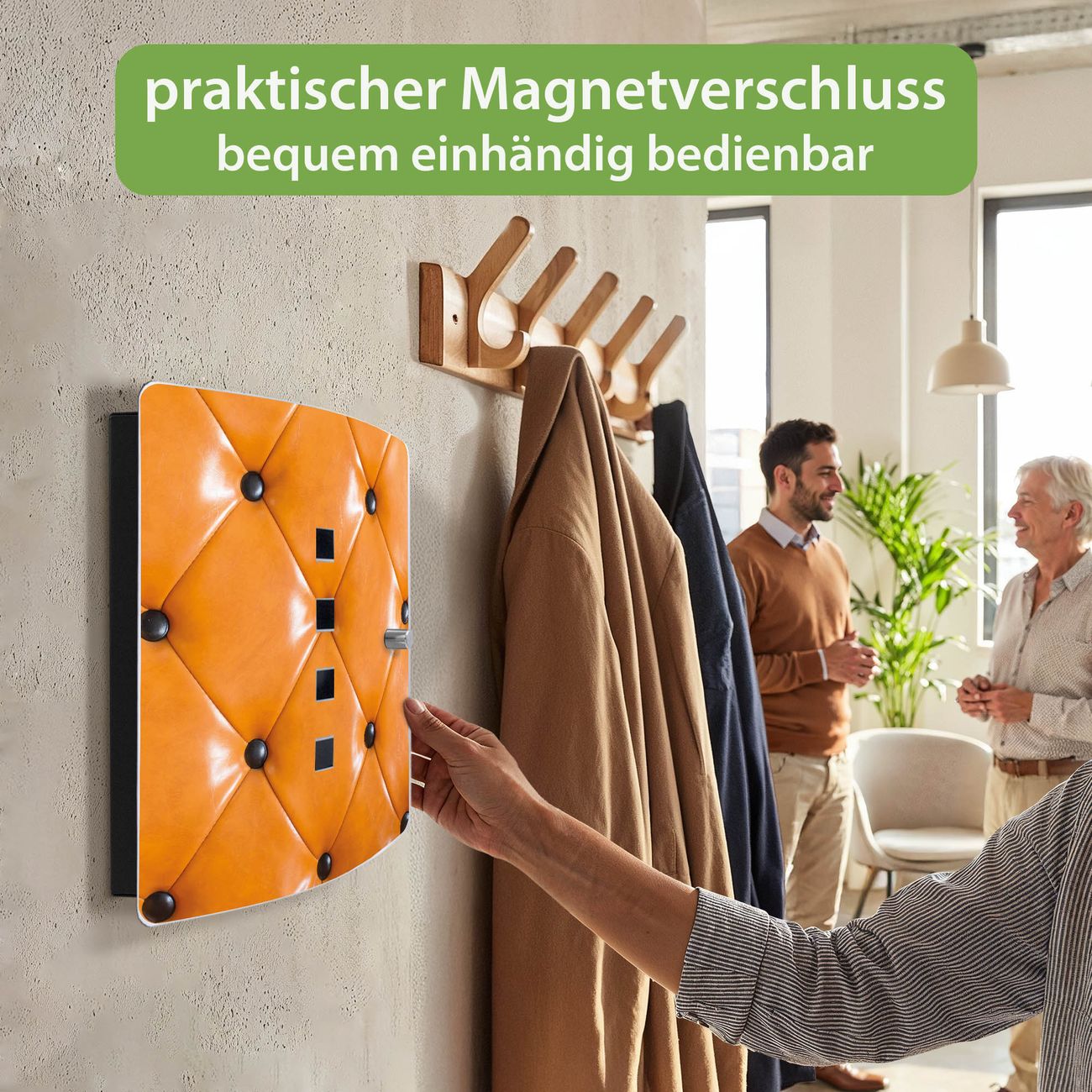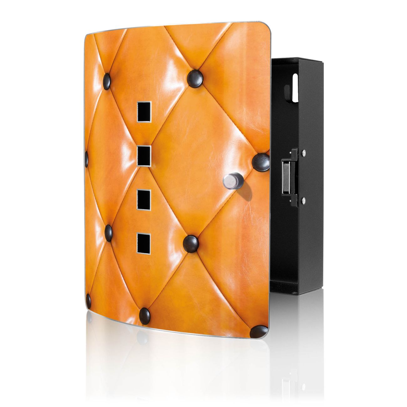 Funktion / Nutzen: Die leicht geschwungene Edelstahltür ist mit einer hochwertigen Motivfolie und dem Motiv Motiv Polster Orange kaschiert. Ein praktischer Magnetverschluss ermöglicht Ihnen ein schnelles Öffnen und Schließen. Befestigt wird der Schlüsselkasten an 2 Stellen auf der Rückseite, passendes Montagematerial fügen wir bereits bei.