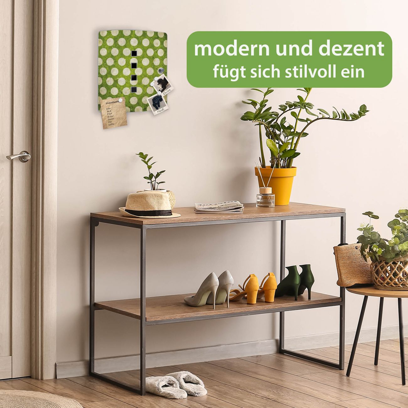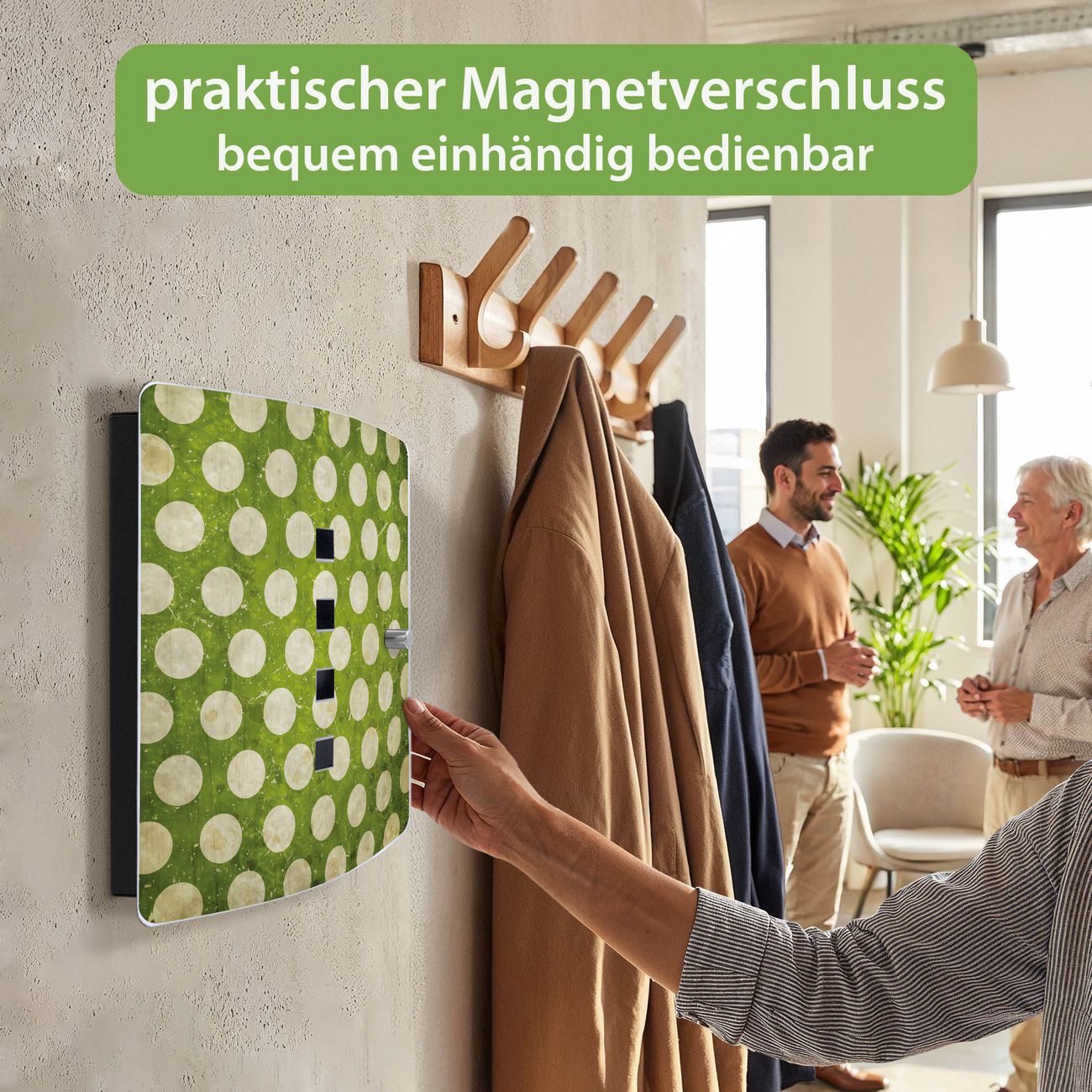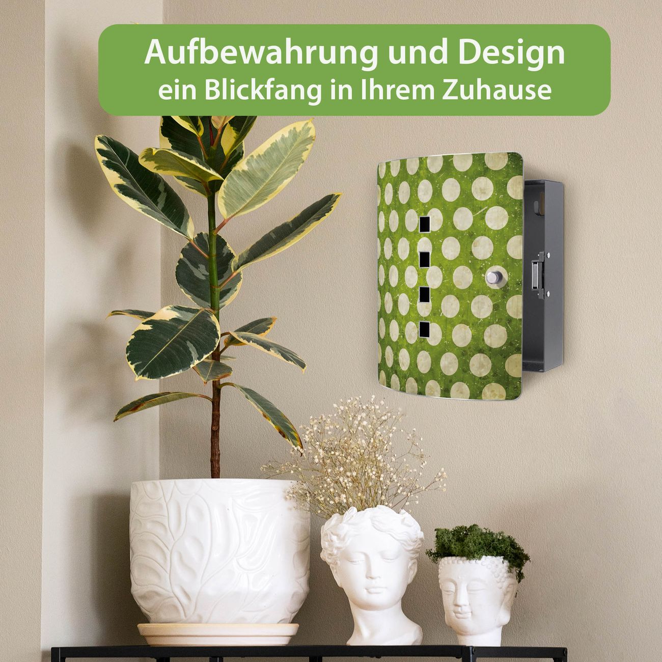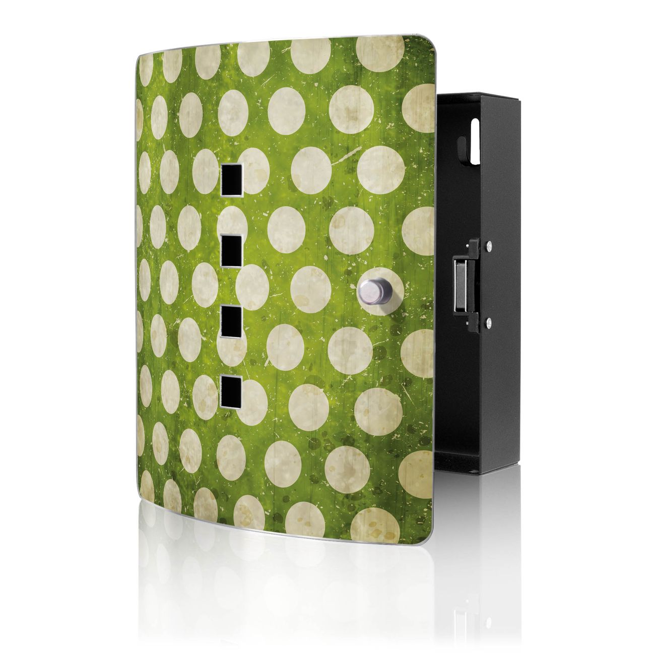 Funktion / Nutzen: Die leicht geschwungene Edelstahltür ist mit einer hochwertigen Motivfolie und dem Motiv Motiv Punkte Grün Vintage kaschiert. Ein praktischer Magnetverschluss ermöglicht Ihnen ein schnelles Öffnen und Schließen. Befestigt wird der Schlüsselkasten an 2 Stellen auf der Rückseite, passendes Montagematerial fügen wir bereits bei.