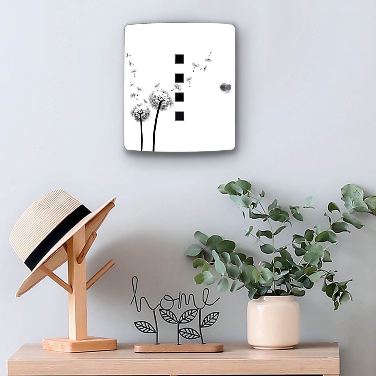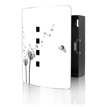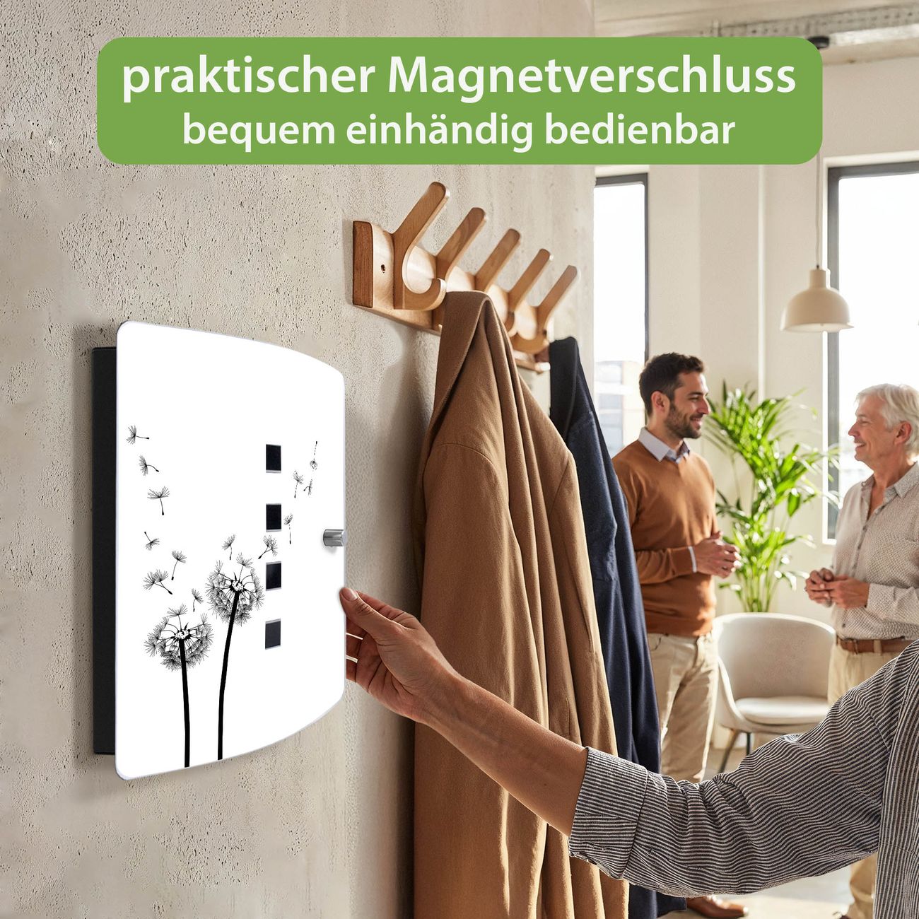 Funktion / Nutzen: Die leicht geschwungene Edelstahltür ist mit einer hochwertigen Motivfolie und dem Motiv Motiv Pusteblume 2 kaschiert. Ein praktischer Magnetverschluss ermöglicht Ihnen ein schnelles Öffnen und Schließen. Befestigt wird der Schlüsselkasten an 2 Stellen auf der Rückseite, passendes Montagematerial fügen wir bereits bei.
