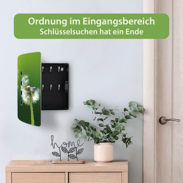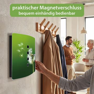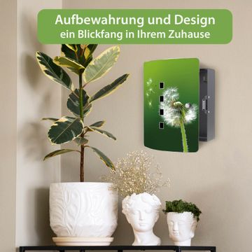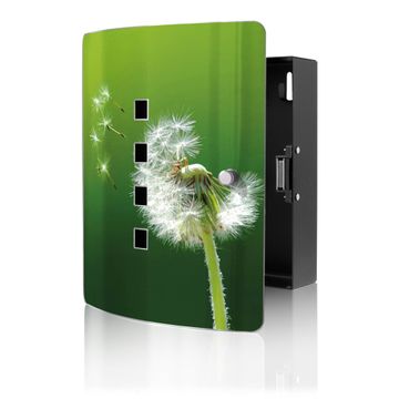 Funktion / Nutzen: Die leicht geschwungene Edelstahltür ist mit einer hochwertigen Motivfolie und dem Motiv Motiv Pusteblume kaschiert. Ein praktischer Magnetverschluss ermöglicht Ihnen ein schnelles Öffnen und Schließen. Befestigt wird der Schlüsselkasten an 2 Stellen auf der Rückseite, passendes Montagematerial fügen wir bereits bei.