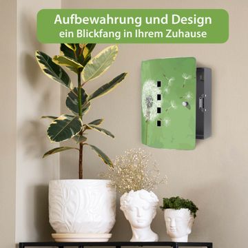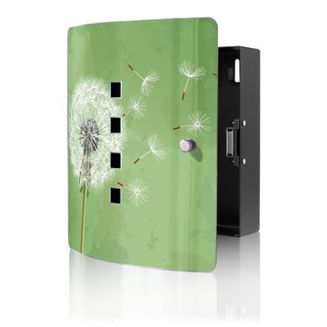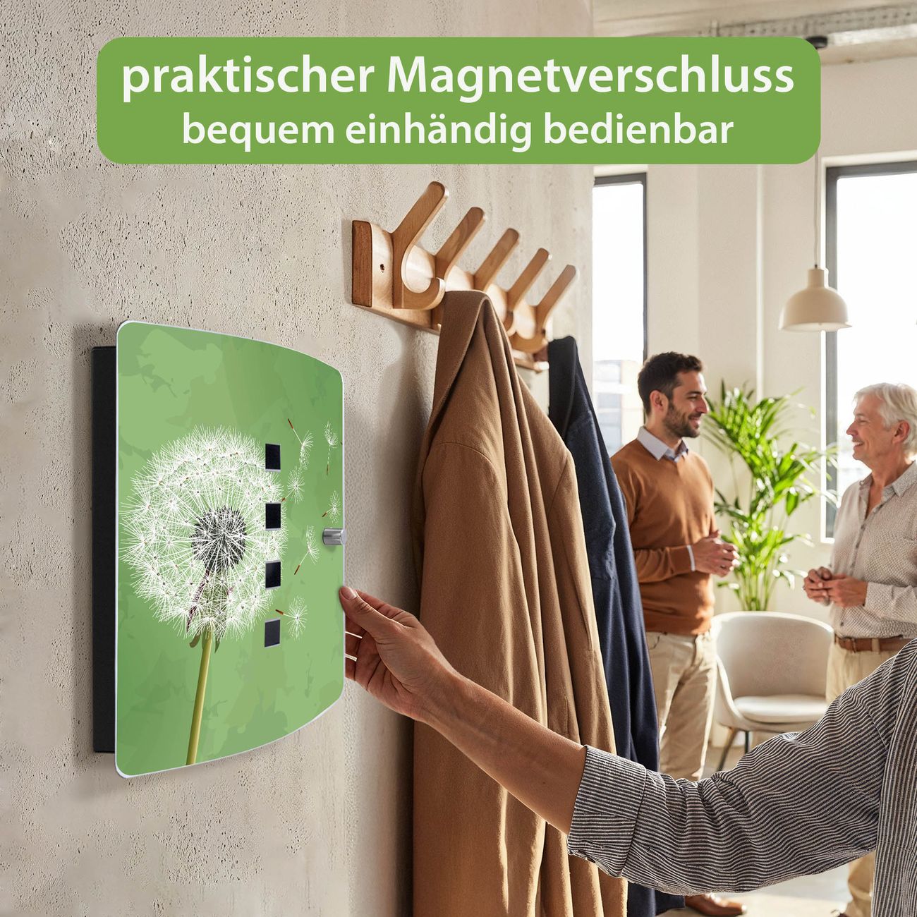 Funktion / Nutzen: Die leicht geschwungene Edelstahltür ist mit einer hochwertigen Motivfolie und dem Motiv Motiv Pusteblume 3 kaschiert. Ein praktischer Magnetverschluss ermöglicht Ihnen ein schnelles Öffnen und Schließen. Befestigt wird der Schlüsselkasten an 2 Stellen auf der Rückseite, passendes Montagematerial fügen wir bereits bei.