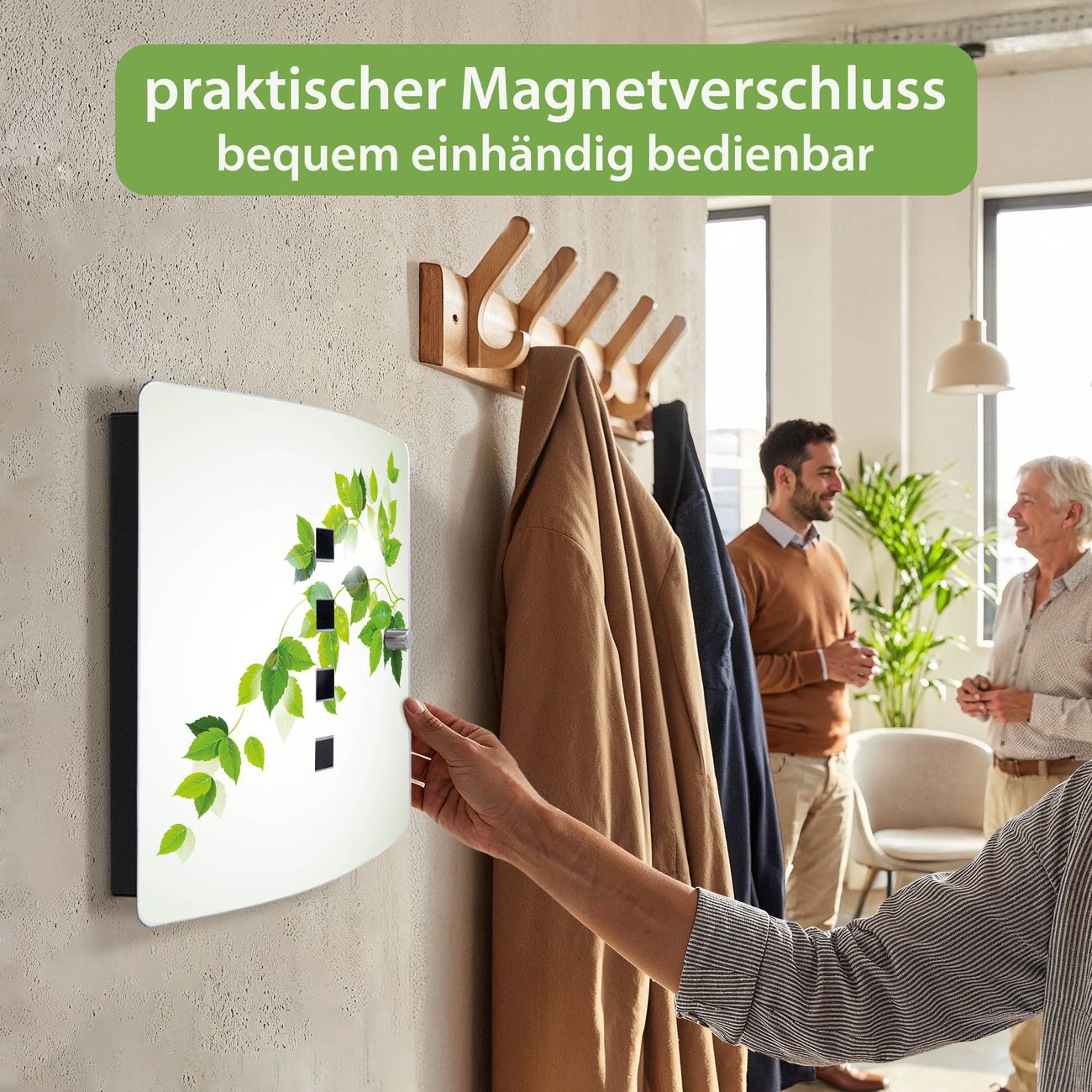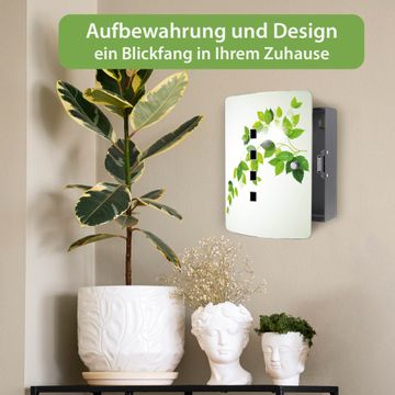 Funktion / Nutzen: Die leicht geschwungene Edelstahltür ist mit einer hochwertigen Motivfolie und dem Motiv Motiv Ranke Gelb Weiß kaschiert. Ein praktischer Magnetverschluss ermöglicht Ihnen ein schnelles Öffnen und Schließen. Befestigt wird der Schlüsselkasten an 2 Stellen auf der Rückseite, passendes Montagematerial fügen wir bereits bei.