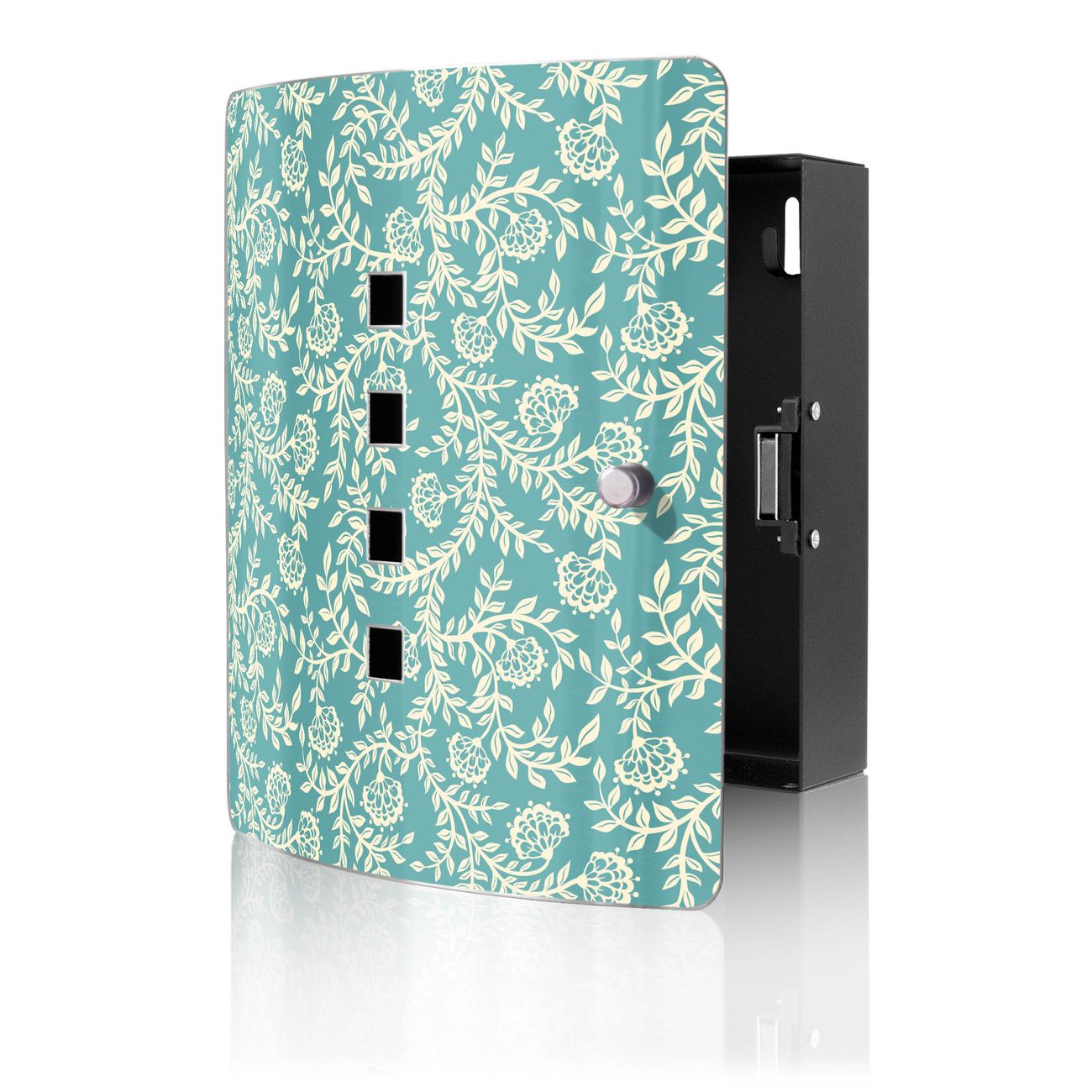 Funktion / Nutzen: Die leicht geschwungene Edelstahltür ist mit einer hochwertigen Motivfolie und dem Motiv Motiv Rankenornament kaschiert. Ein praktischer Magnetverschluss ermöglicht Ihnen ein schnelles Öffnen und Schließen. Befestigt wird der Schlüsselkasten an 2 Stellen auf der Rückseite, passendes Montagematerial fügen wir bereits bei.