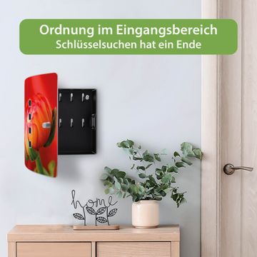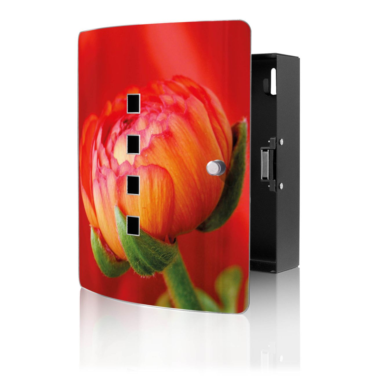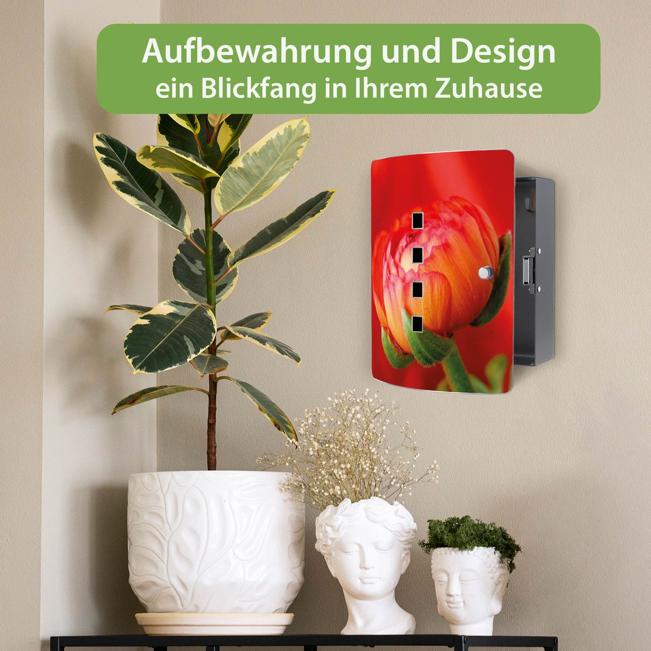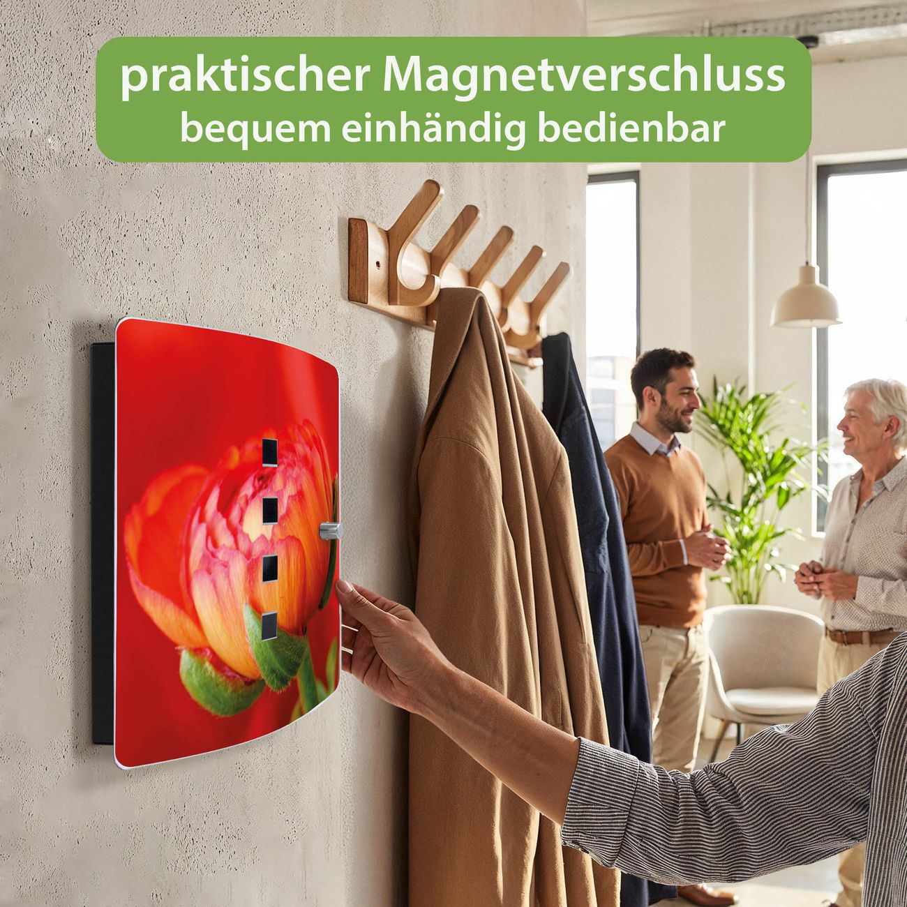 Funktion / Nutzen: Die leicht geschwungene Edelstahltür ist mit einer hochwertigen Motivfolie und dem Motiv Motiv Ranunkel kaschiert. Ein praktischer Magnetverschluss ermöglicht Ihnen ein schnelles Öffnen und Schließen. Befestigt wird der Schlüsselkasten an 2 Stellen auf der Rückseite, passendes Montagematerial fügen wir bereits bei.