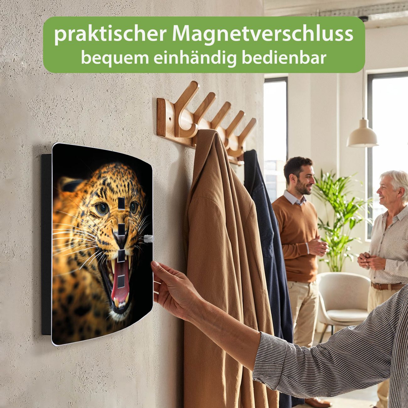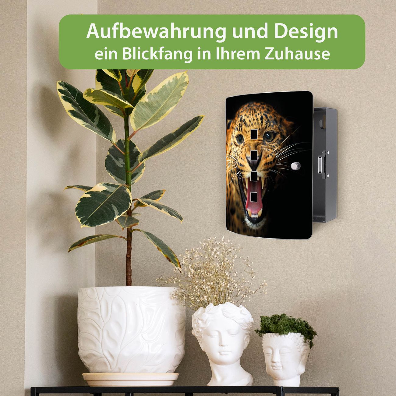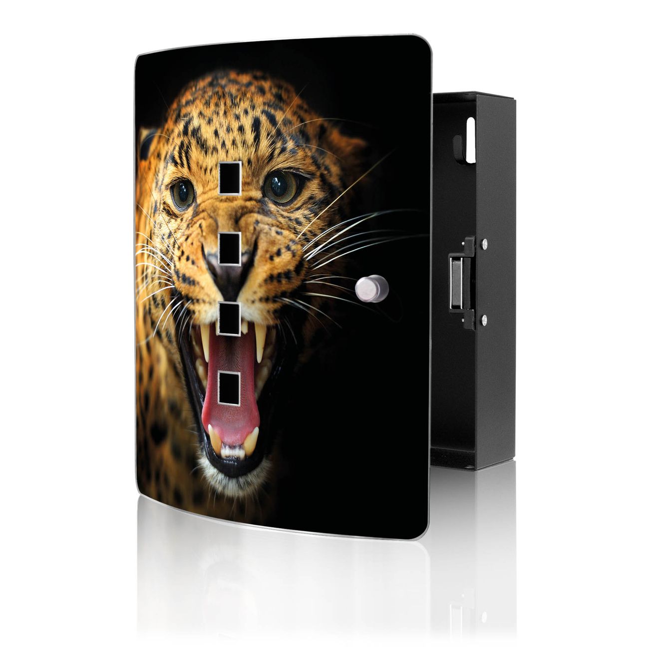 Funktion / Nutzen: Die leicht geschwungene Edelstahltür ist mit einer hochwertigen Motivfolie und dem Motiv Motiv Raubkatze kaschiert. Ein praktischer Magnetverschluss ermöglicht Ihnen ein schnelles Öffnen und Schließen. Befestigt wird der Schlüsselkasten an 2 Stellen auf der Rückseite, passendes Montagematerial fügen wir bereits bei.