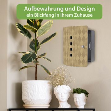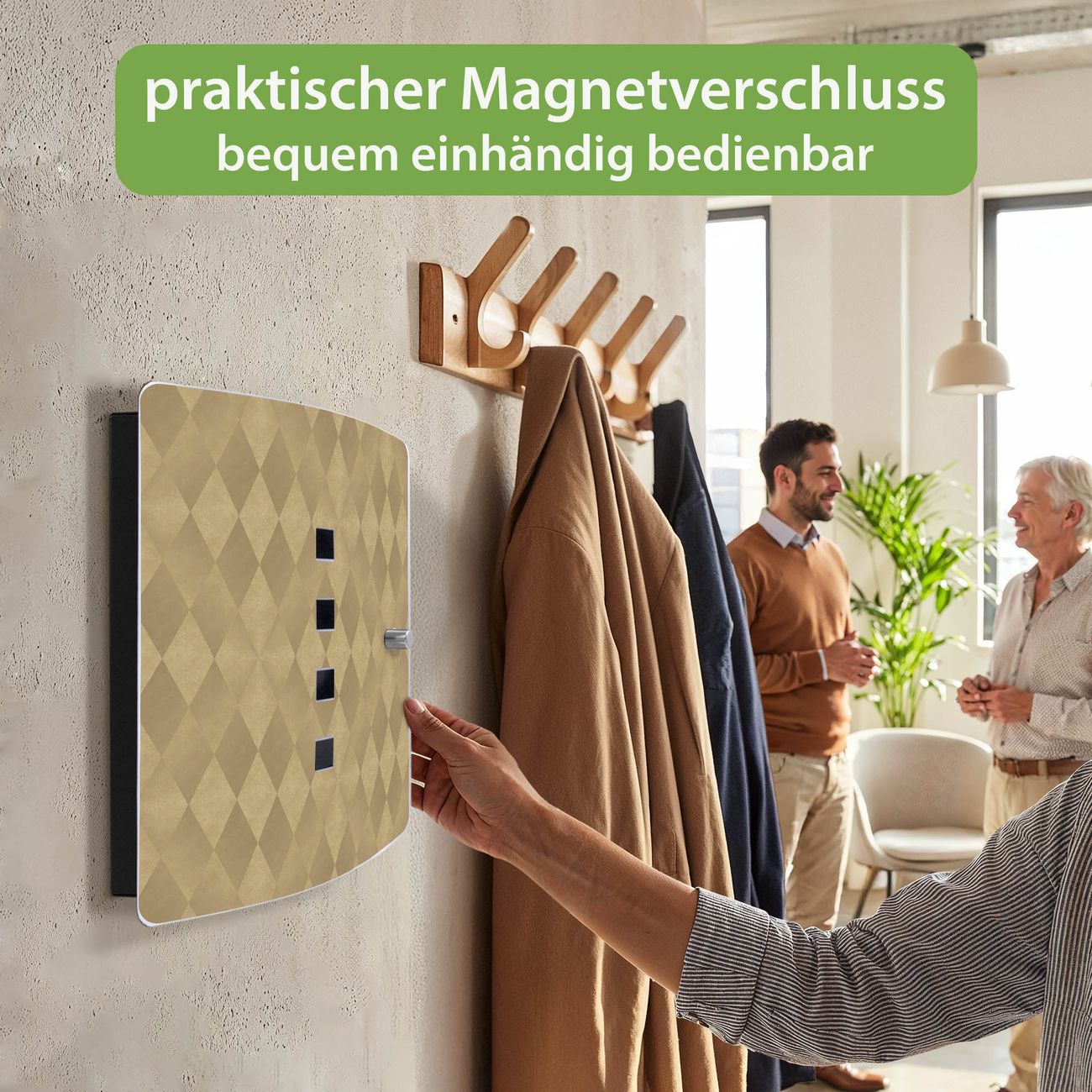 Funktion / Nutzen: Die leicht geschwungene Edelstahltür ist mit einer hochwertigen Motivfolie und dem Motiv Motiv Rauten Metall kaschiert. Ein praktischer Magnetverschluss ermöglicht Ihnen ein schnelles Öffnen und Schließen. Befestigt wird der Schlüsselkasten an 2 Stellen auf der Rückseite, passendes Montagematerial fügen wir bereits bei.