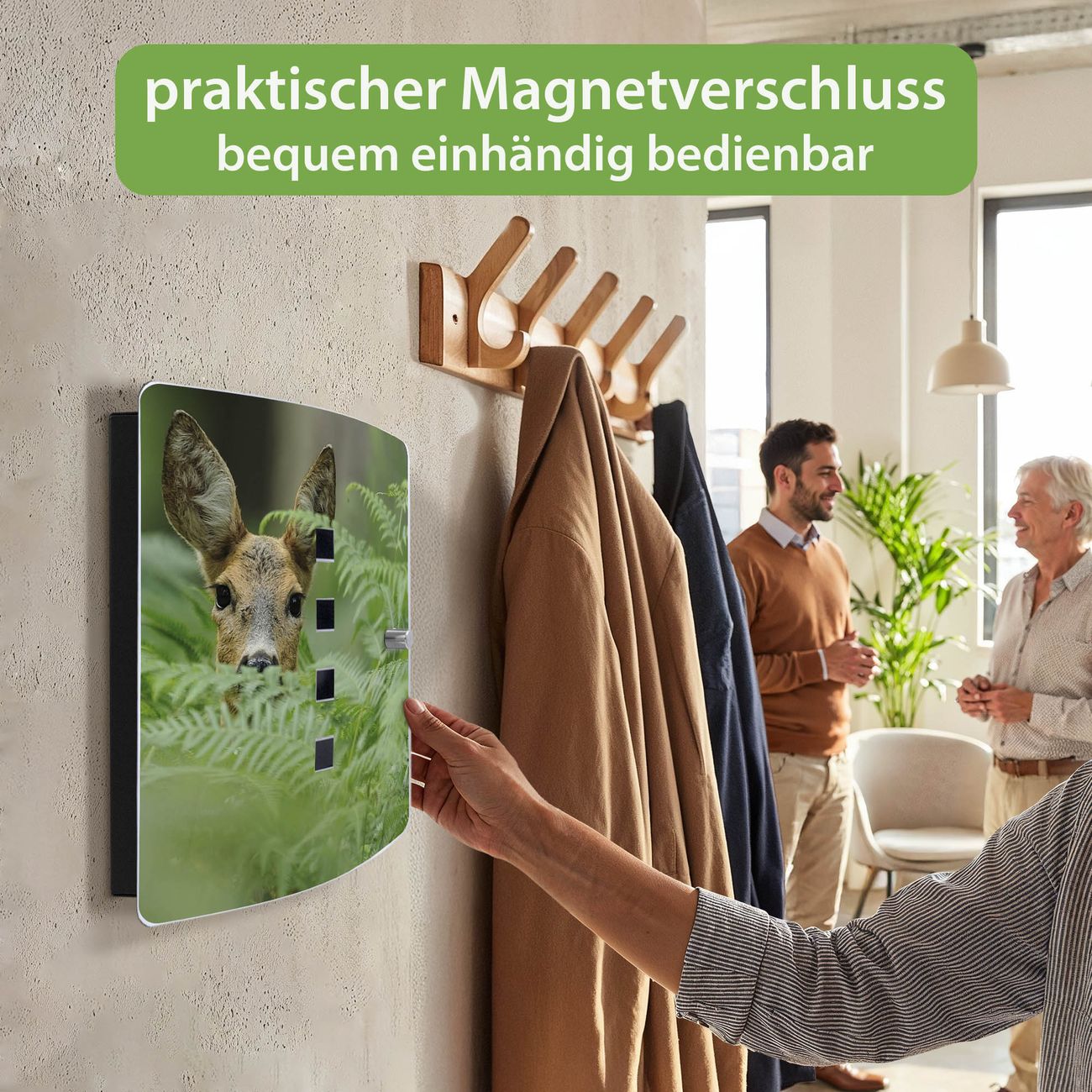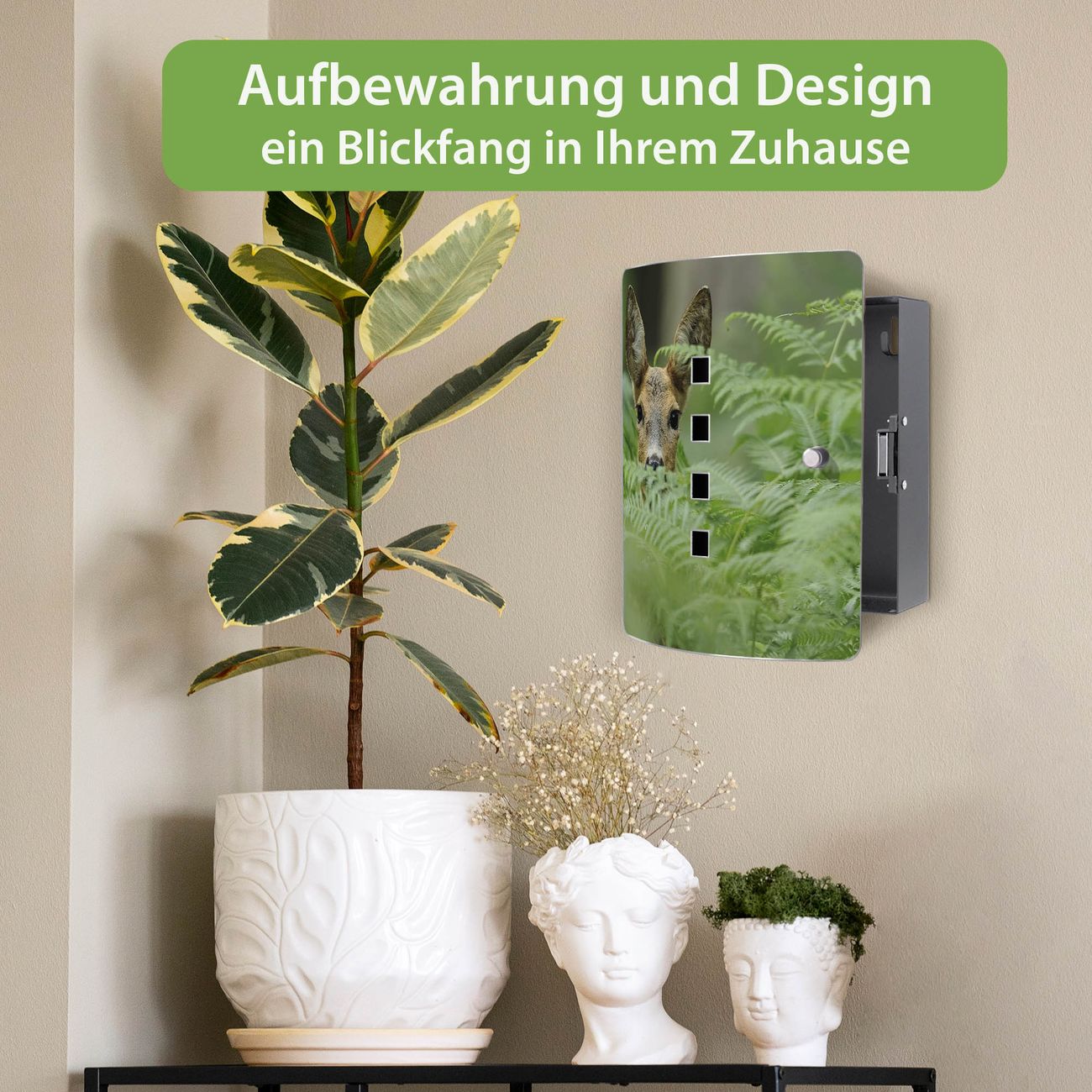 Funktion / Nutzen: Die leicht geschwungene Edelstahltür ist mit einer hochwertigen Motivfolie und dem Motiv Motiv Reh kaschiert. Ein praktischer Magnetverschluss ermöglicht Ihnen ein schnelles Öffnen und Schließen. Befestigt wird der Schlüsselkasten an 2 Stellen auf der Rückseite, passendes Montagematerial fügen wir bereits bei.